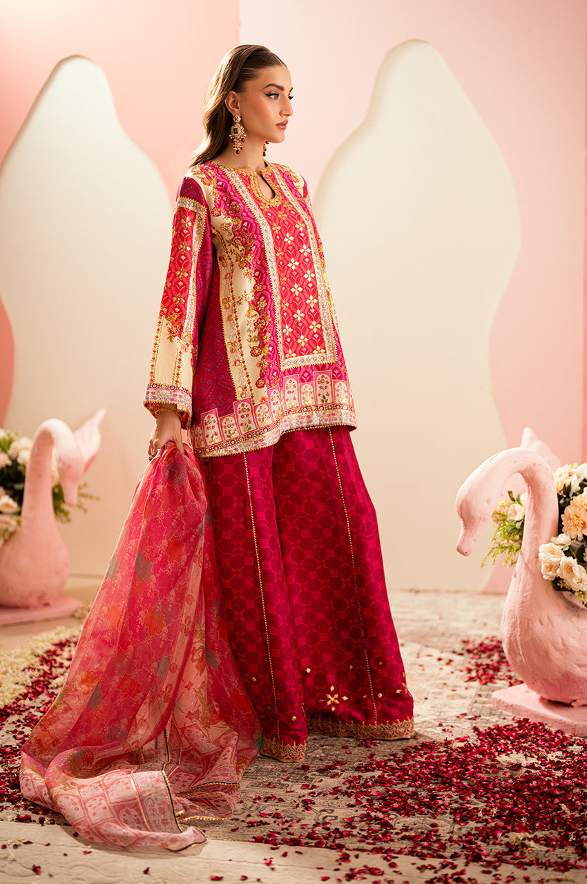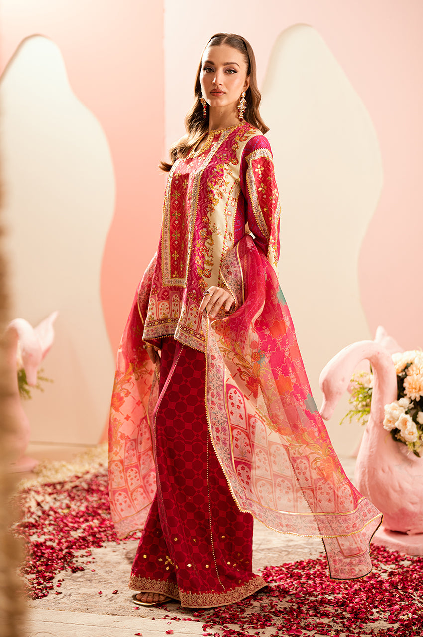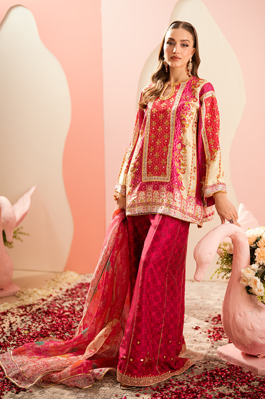 A mesmerizing play of tradition and modernity, this Sarah Sheeraz ensemble features a beautifully printed short shirt adorned with exquisite zari and gota detailing that glimmers with every movement. Paired with matching palazzo pants, crafted to perfection with the same intricate accents, the look exudes effortless grace and festive charm. Completing the outfit is a pure organza printed dupatta, delicately finished with gota edging, adding a hint of ethereal allure. A statement in refined elegance, this design captures the essence of timeless celebration with a contemporary twist.