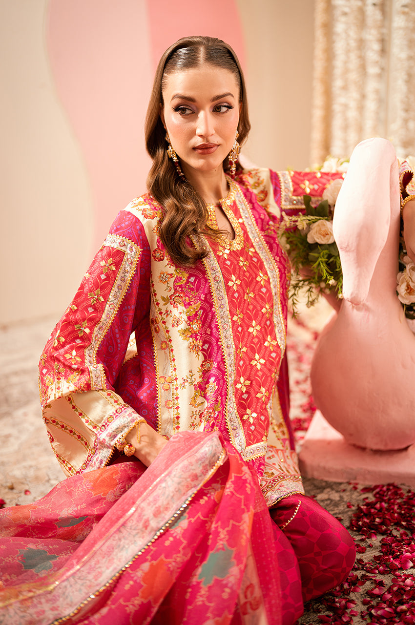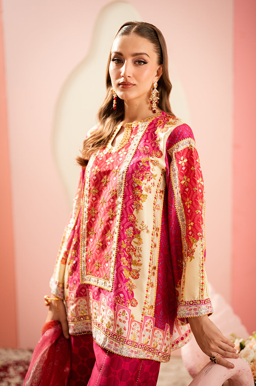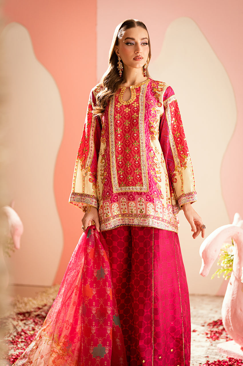 A mesmerizing play of tradition and modernity, this Sarah Sheeraz ensemble features a beautifully printed short shirt adorned with exquisite zari and gota detailing that glimmers with every movement. Paired with matching palazzo pants, crafted to perfection with the same intricate accents, the look exudes effortless grace and festive charm. Completing the outfit is a pure organza printed dupatta, delicately finished with gota edging, adding a hint of ethereal allure. A statement in refined elegance, this design captures the essence of timeless celebration with a contemporary twist.