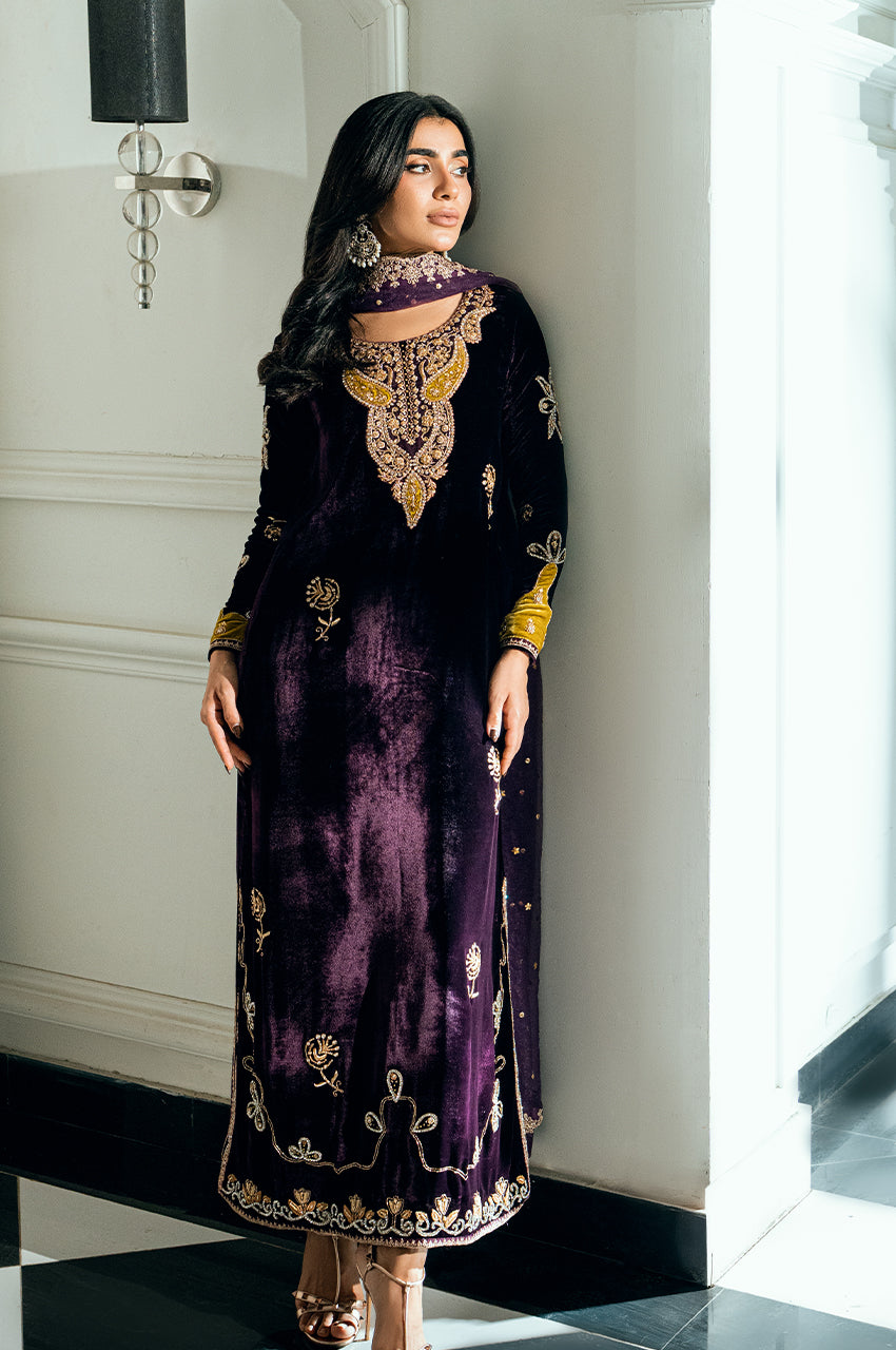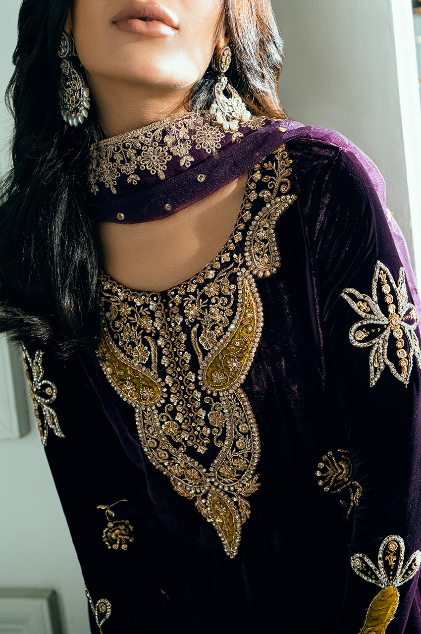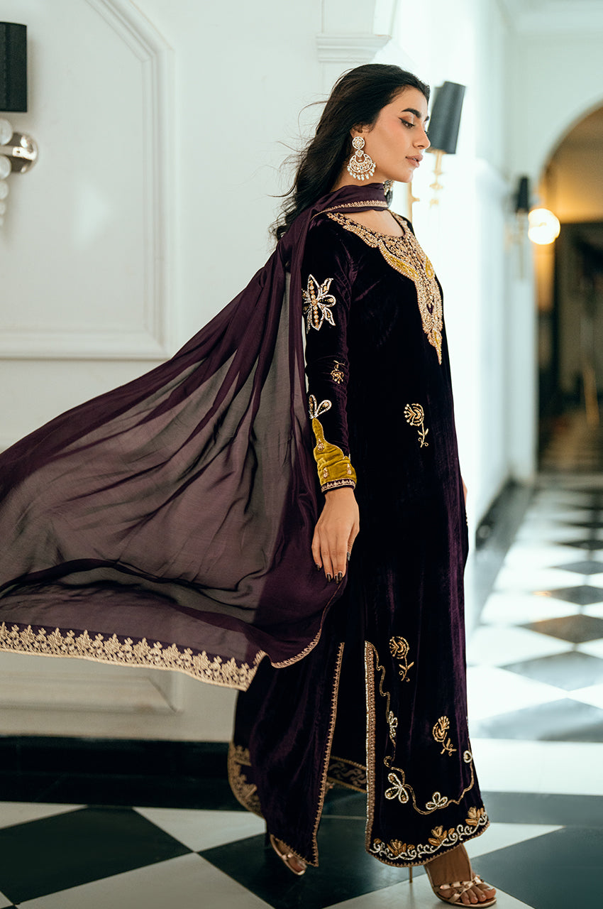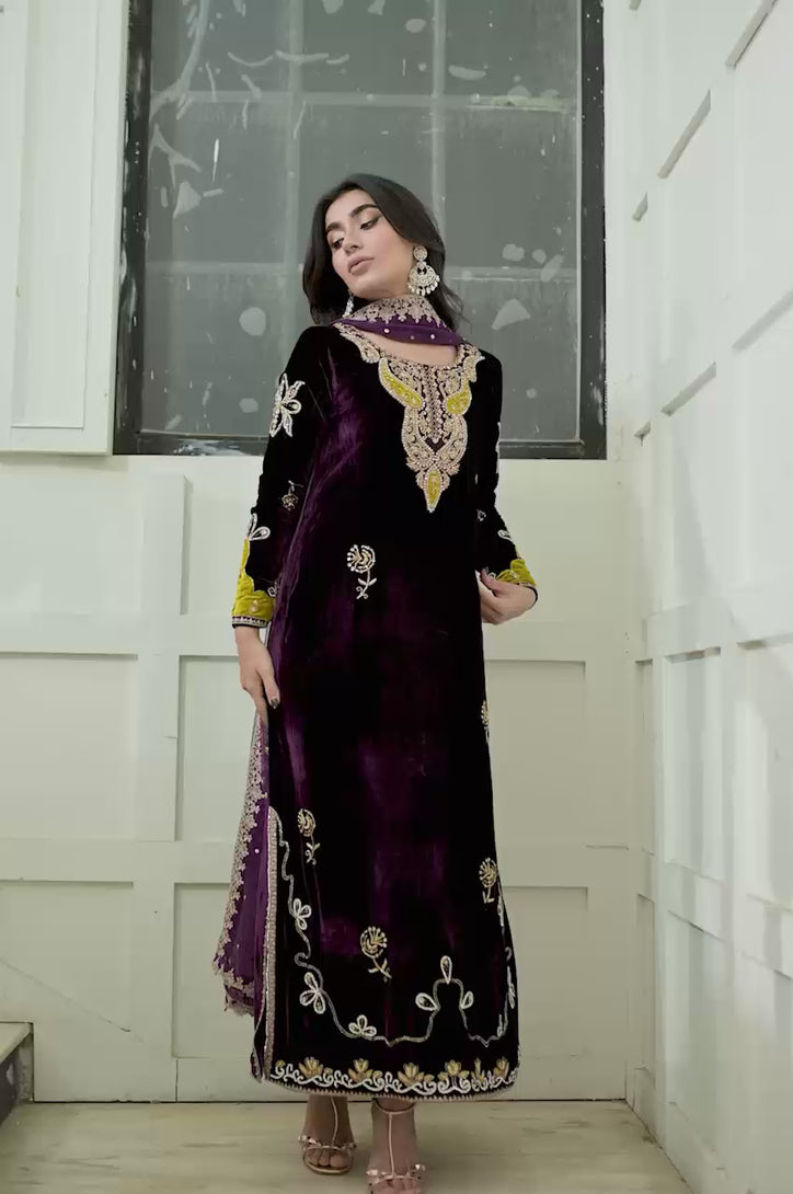 Regal and contemporary, this purple shirt is a dazzling display of intricate craftsmanship. Adorned with olive green appliqué, delicate resham embroidery, and sparkling gold cutdana, the shirt is further enriched with meticulously placed stones that cover the fabric in a rich, textured pattern. The ensemble offers versatility with two exquisite dupatta options — a net chan dupatta or a silk dupatta, each adorned with elegant zari detailing — perfectly paired with pure raw silk pants. A harmonious blend of color, texture, and artisanal luxury, this outfit exudes sophistication and festive grandeur.