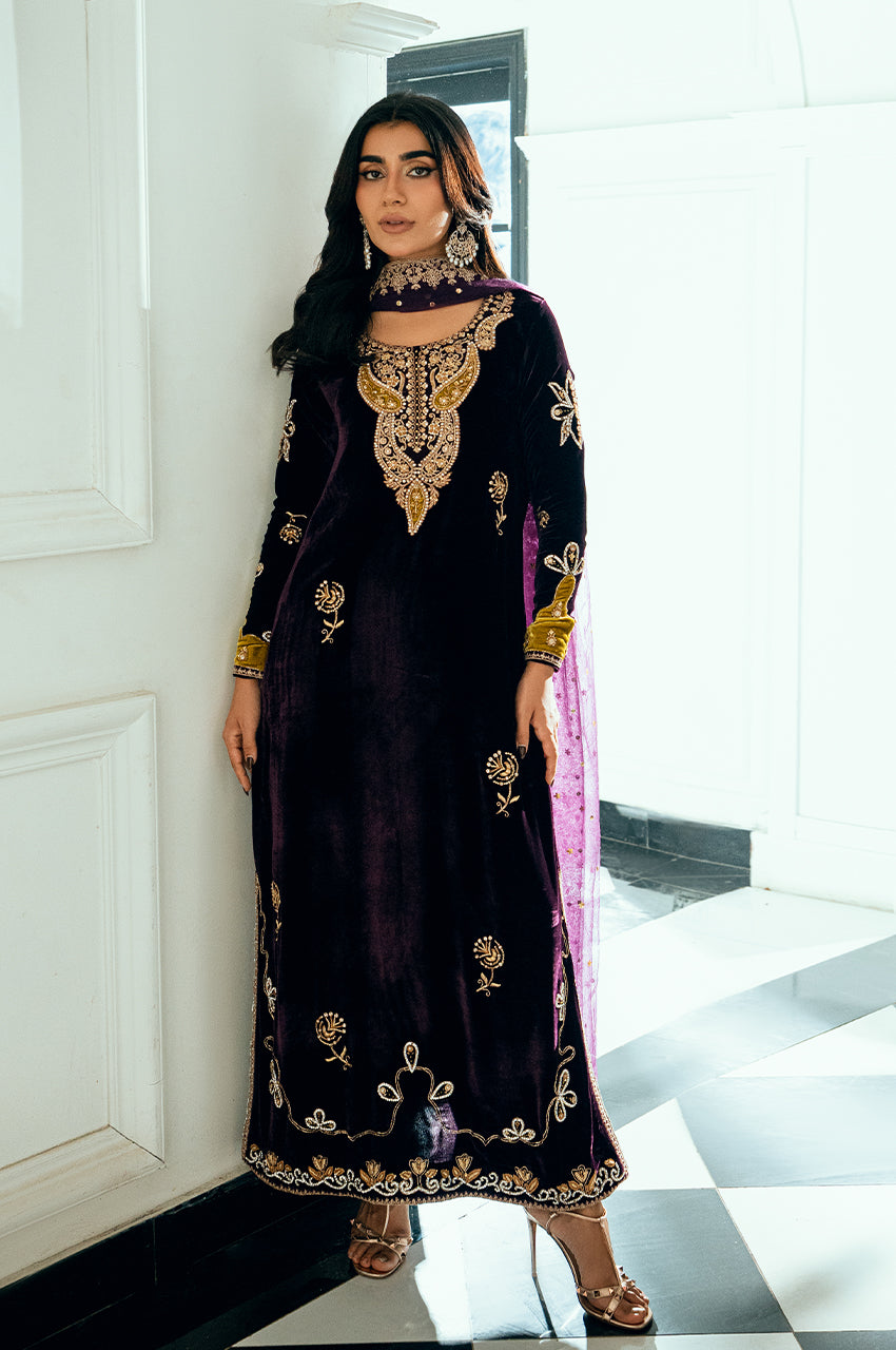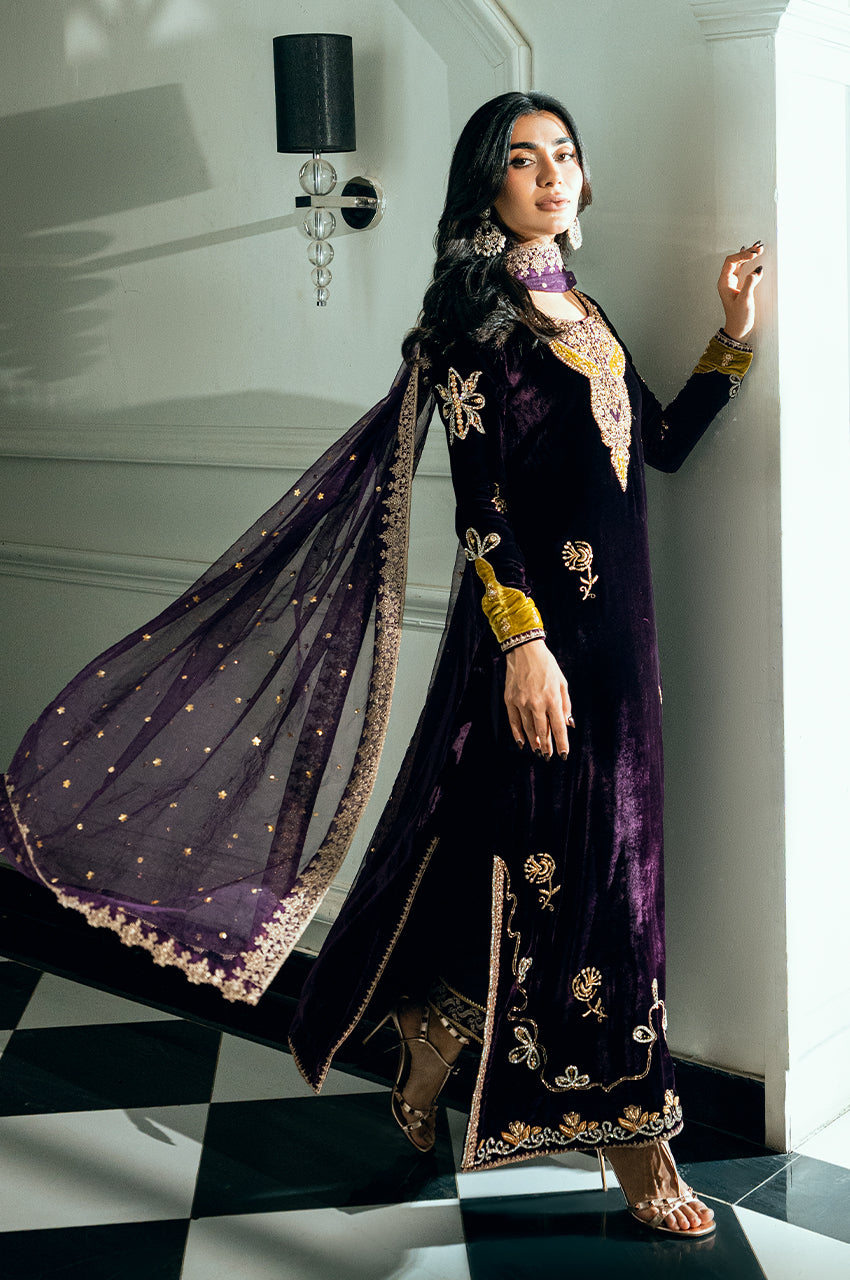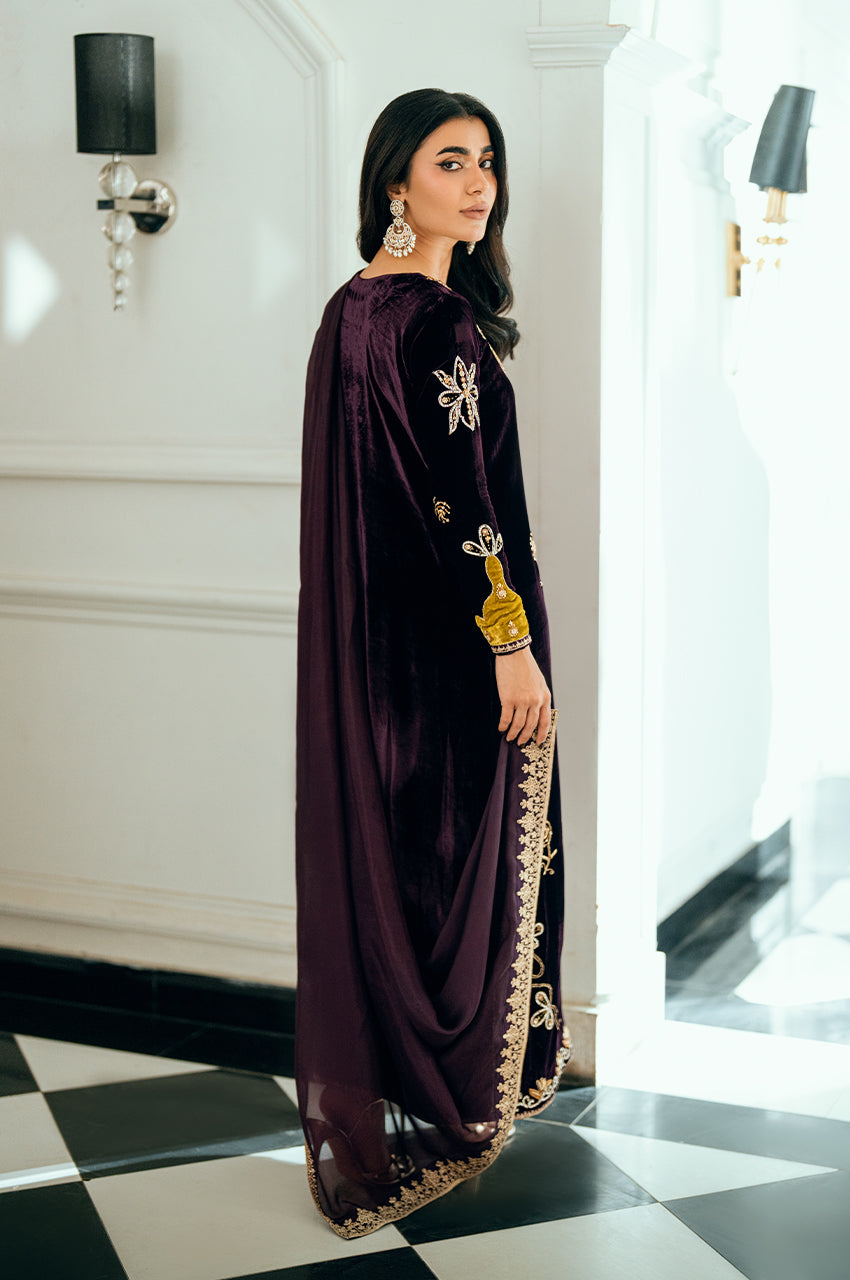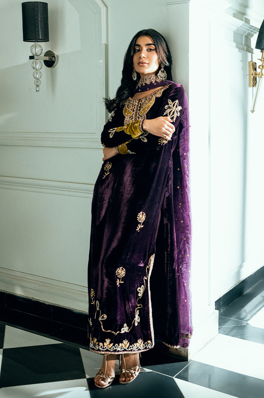 Regal and contemporary, this purple shirt is a dazzling display of intricate craftsmanship. Adorned with olive green appliqué, delicate resham embroidery, and sparkling gold cutdana, the shirt is further enriched with meticulously placed stones that cover the fabric in a rich, textured pattern. The ensemble offers versatility with two exquisite dupatta options — a net chan dupatta or a silk dupatta, each adorned with elegant zari detailing — perfectly paired with pure raw silk pants. A harmonious blend of color, texture, and artisanal luxury, this outfit exudes sophistication and festive grandeur.