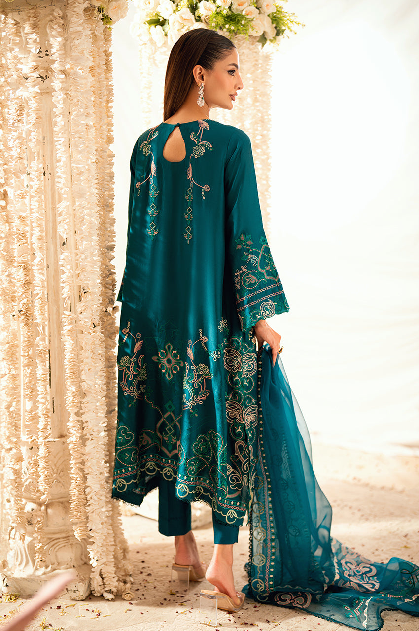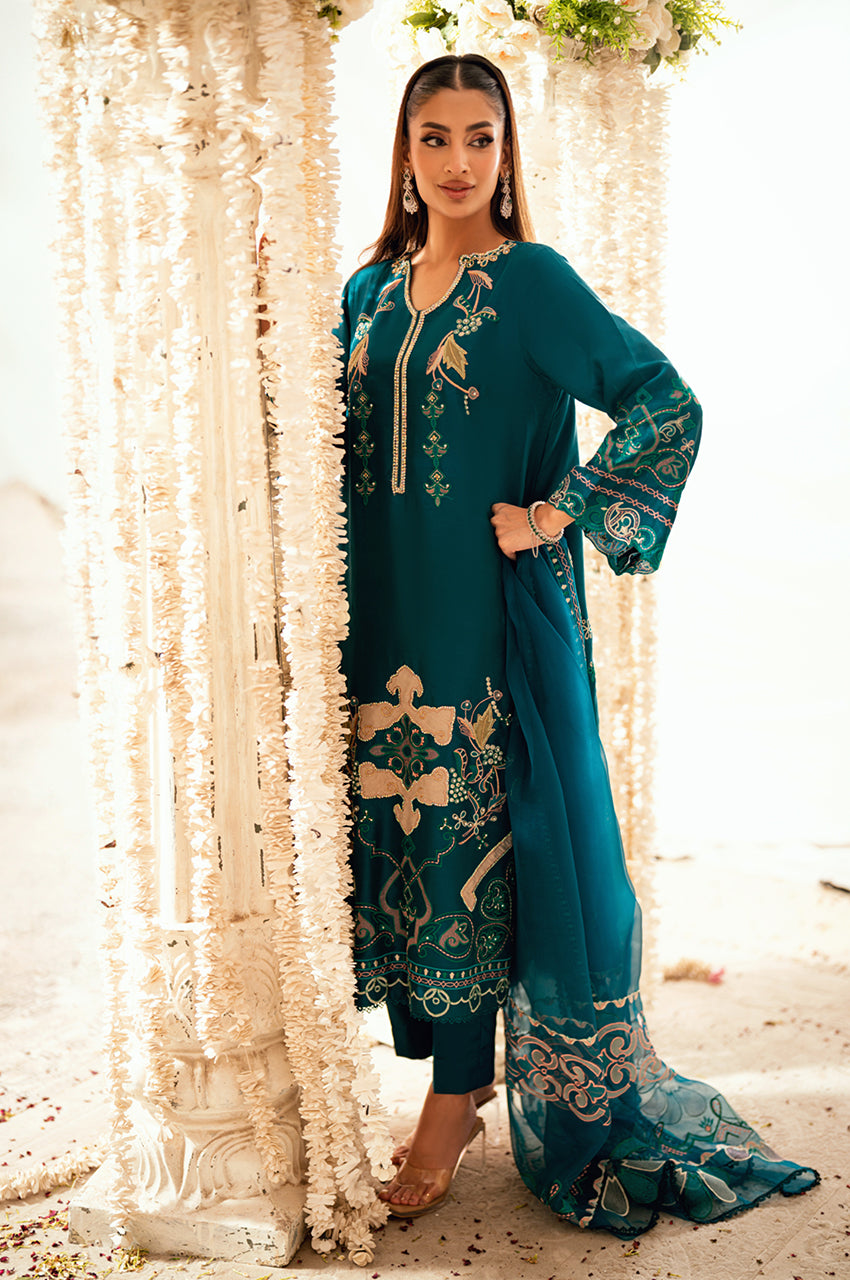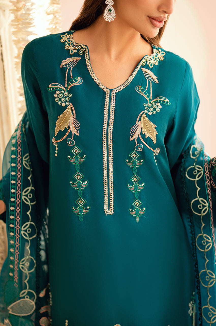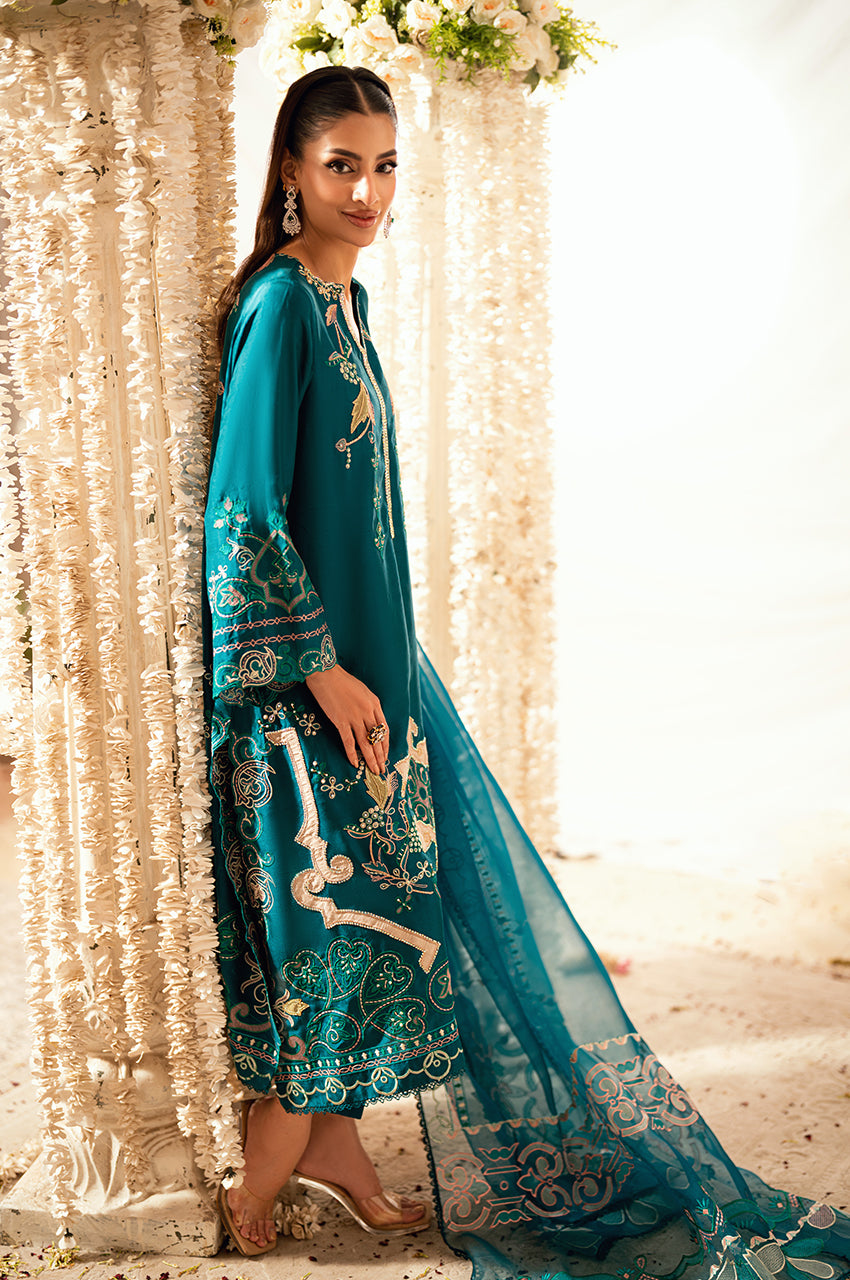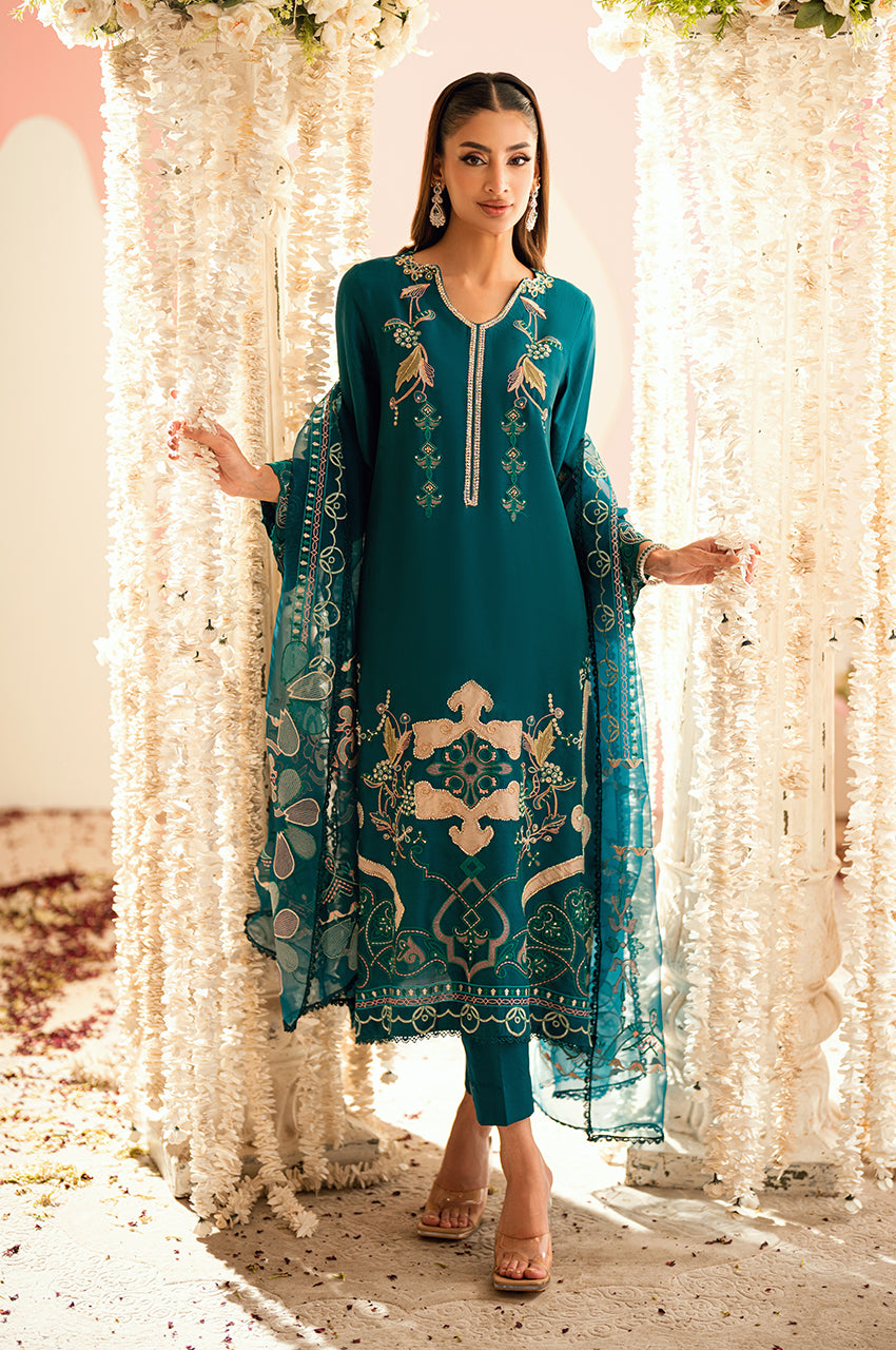 A captivating ode to elegance, this teal green embroidered shirt stands out with its exquisite appliqué detailing that adds depth and dimension to its rich hue. The intricate craftsmanship lends a touch of artistry, perfectly balanced by a graceful silhouette. Paired with a delicately embroidered organza dupatta that exudes ethereal charm, the ensemble radiates timeless sophistication. Effortlessly refined yet strikingly unique, it’s a look that embodies understated luxury with a contemporary spirit.