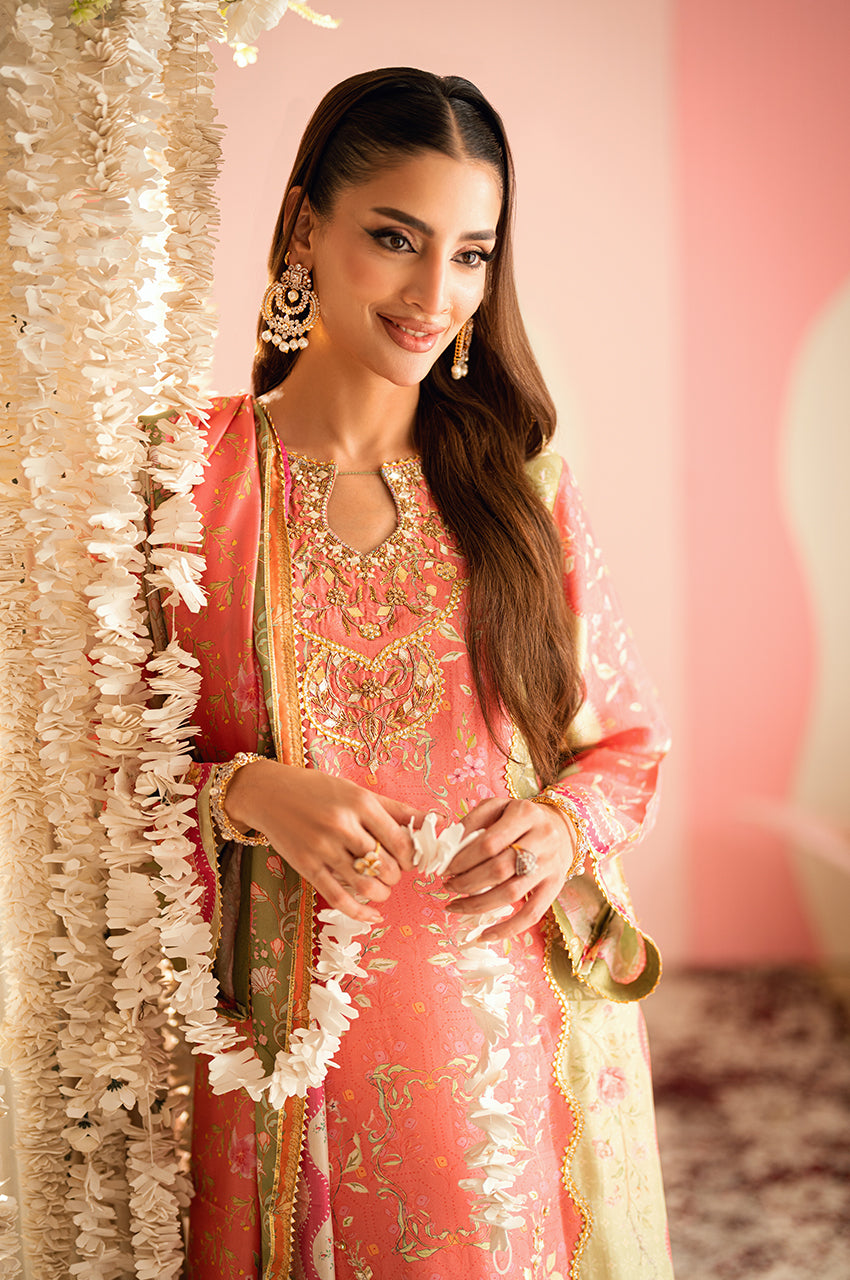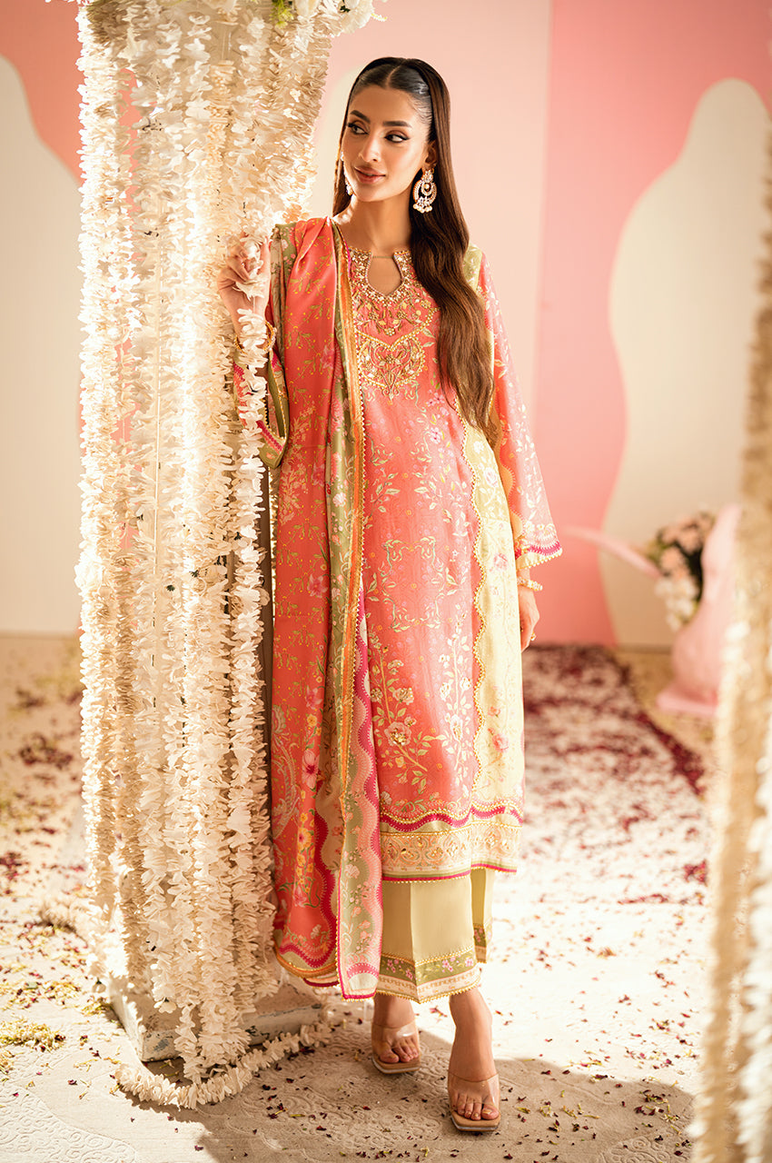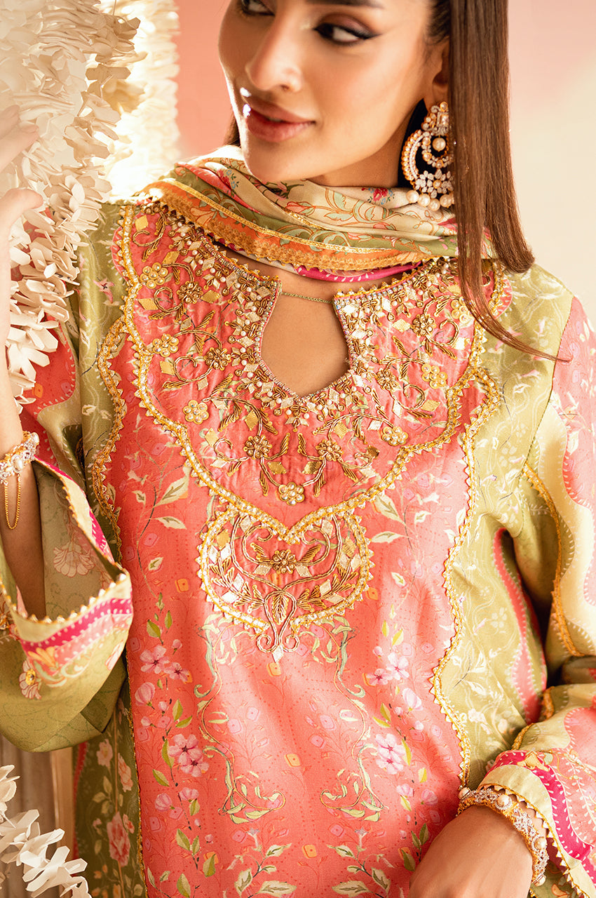 A refreshing interplay of color and charm, this pink and olive printed shirt captures a modern yet graceful aesthetic. The contrasting tones blend effortlessly, creating a look that’s both lively and refined. Paired with a fluid medium silk printed dupatta that mirrors its artistic hues, the ensemble radiates easy elegance. Perfect for the woman who embraces subtle drama, this look transitions seamlessly from daytime sophistication to evening allure.