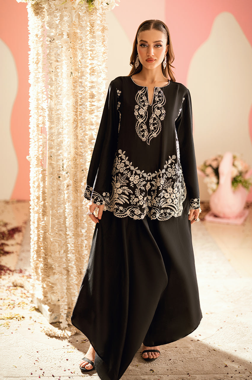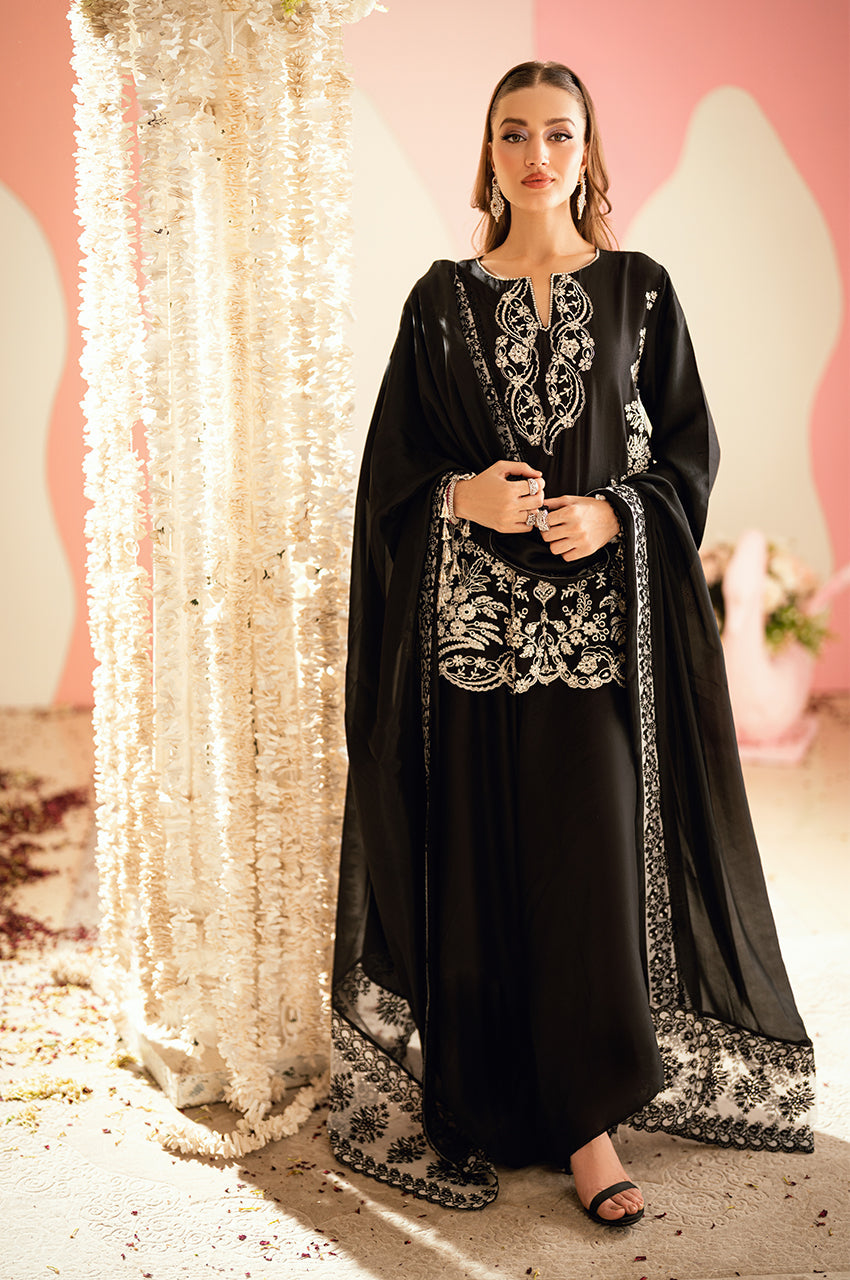 A vision of timeless allure, this black embroidered short shirt commands attention with its exquisite silver cutdana and pearl work — shimmering with every graceful movement. The intricate embellishment adds depth and drama to the rich canvas, while the modern tailored plazo lends a contemporary edge to the ensemble. Completing the look is a luxurious silk dupatta, featuring an enchanting embroidered pallu that drapes with effortless elegance. Bold yet refined, this look embodies modern glamour with a touch of classic sophistication.