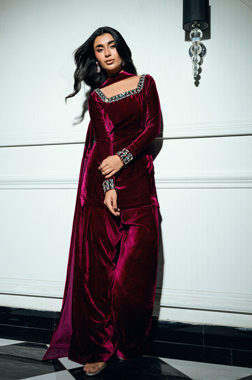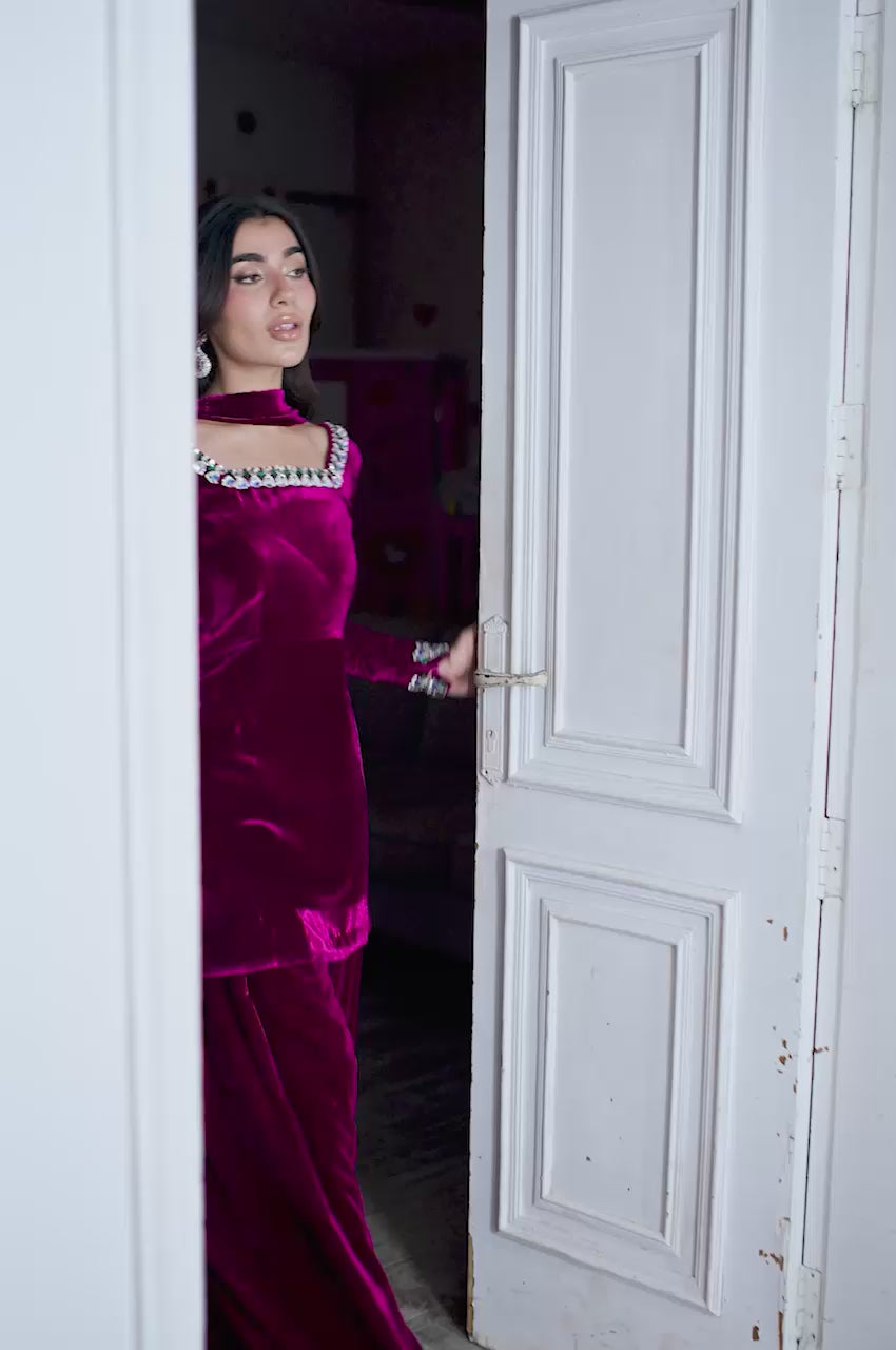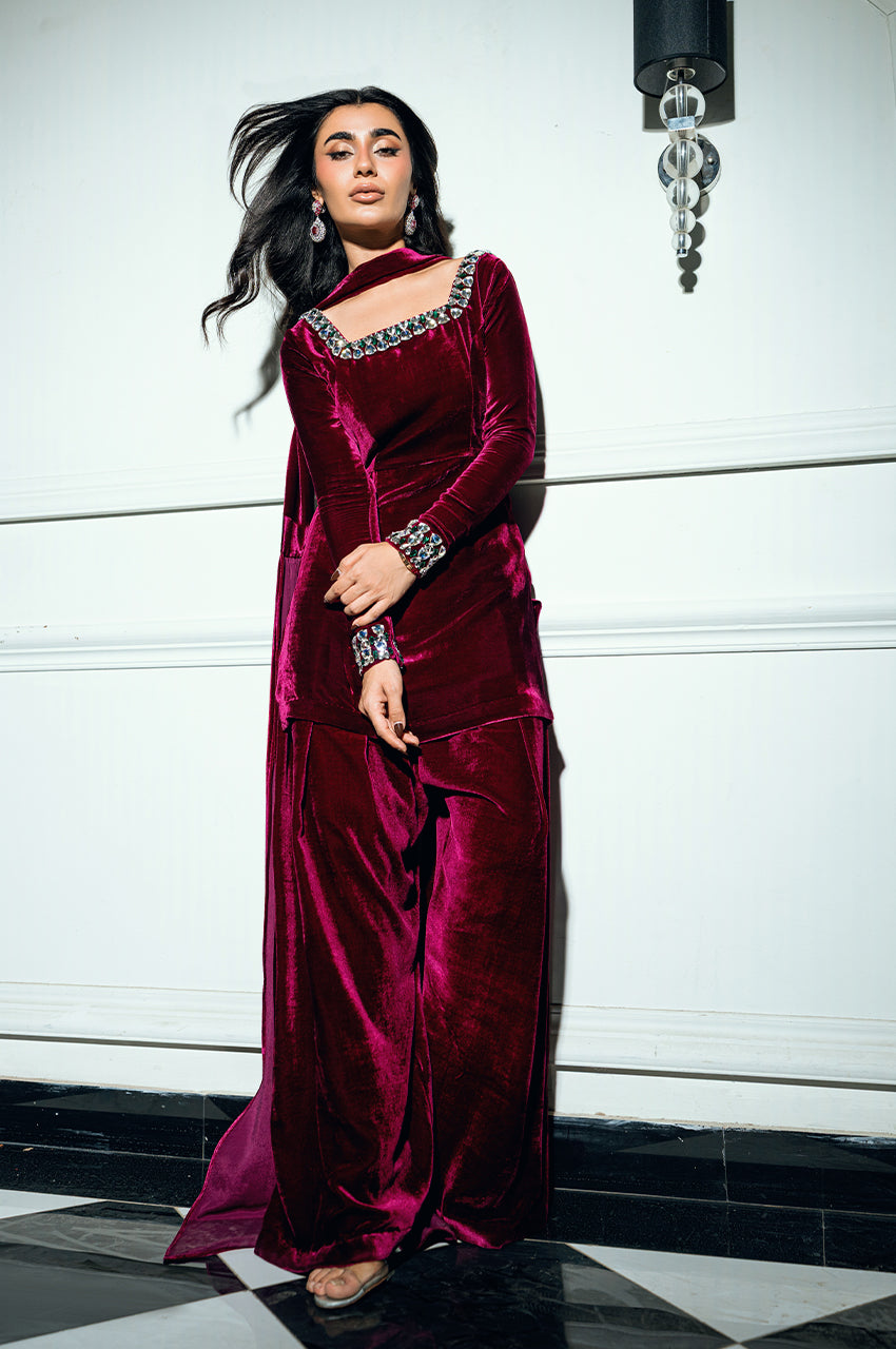 The shirt features an intricately embellished neckline, adorned with contemporary stone work set against a plush velvet base — a stunning fusion of texture and brilliance. Paired with a tailored shalwar for effortless elegance, it is completed with a sleek velvet dupatta showcasing an innovative new technique that elevates the look with artistic finesse. Bold yet refined, this creation beautifully balances modern design with timeless allure.