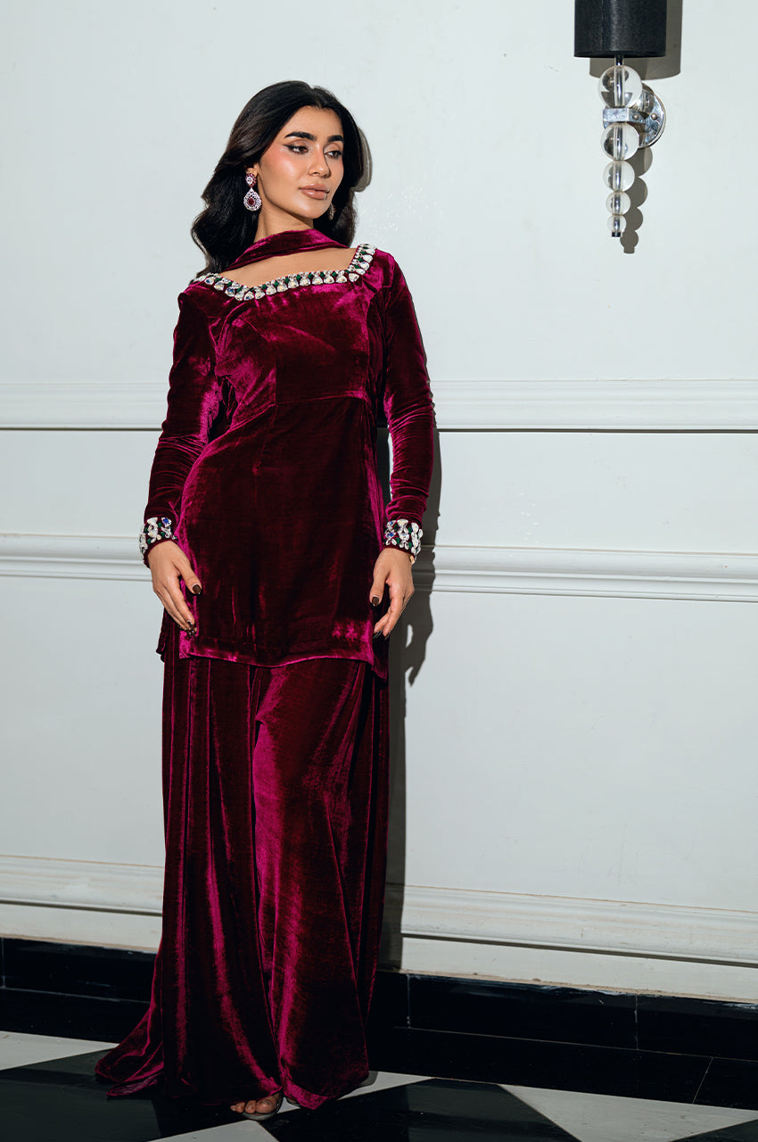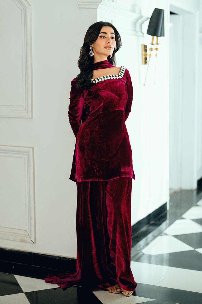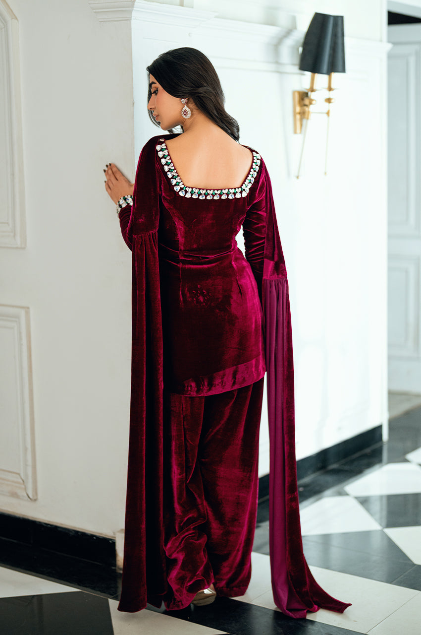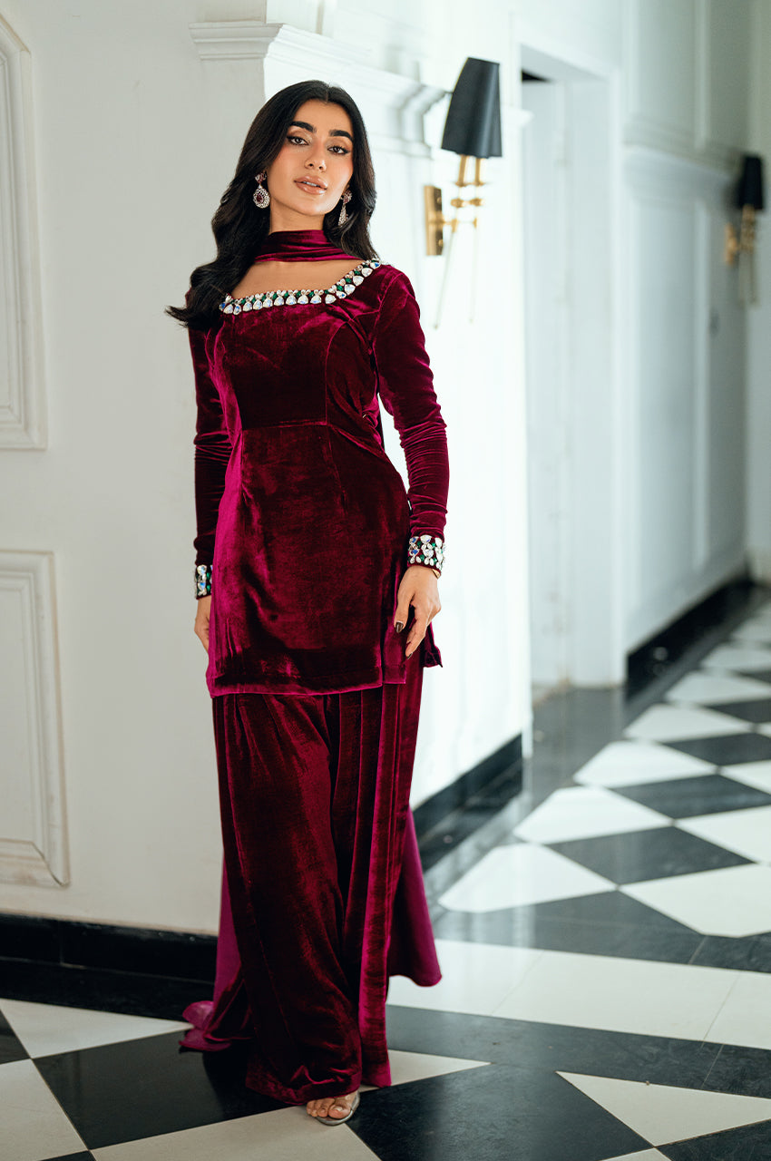 The shirt features an intricately embellished neckline, adorned with contemporary stone work set against a plush velvet base — a stunning fusion of texture and brilliance. Paired with a tailored shalwar for effortless elegance, it is completed with a sleek velvet dupatta showcasing an innovative new technique that elevates the look with artistic finesse. Bold yet refined, this creation beautifully balances modern design with timeless allure.