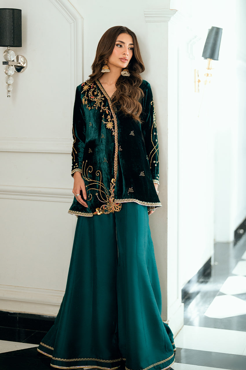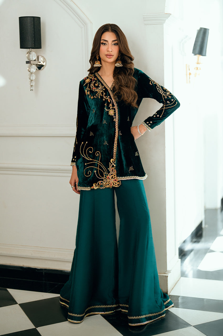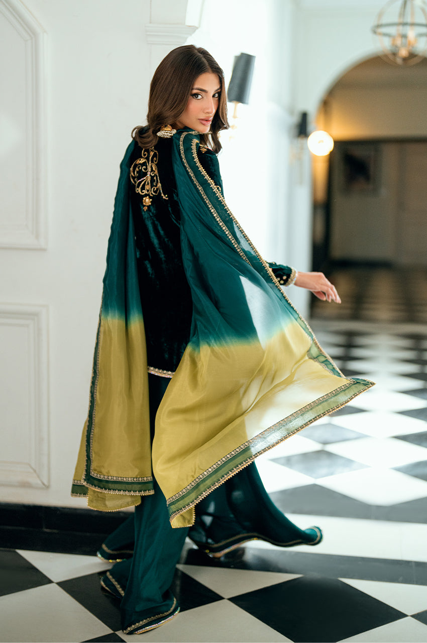 Regal and captivating, this emerald green angrakha is a masterpiece of timeless elegance. Meticulously adorned with intricate cutwork, delicate resham embroidery, and opulent zari detailing, it exudes a rich, artisanal charm. The silhouette flows gracefully, capturing both tradition and modern refinement. Paired with a luxurious raw silk palazzo featuring subtle zari accents and complemented by a two-toned silk dupatta that adds depth and contrast, this ensemble radiates sophistication — a true celebration of heritage craftsmanship and contemporary grace.
