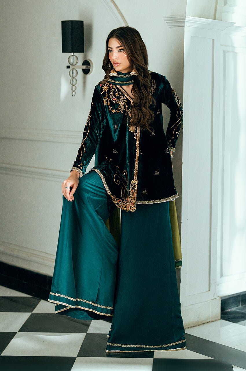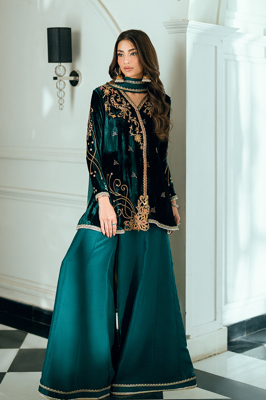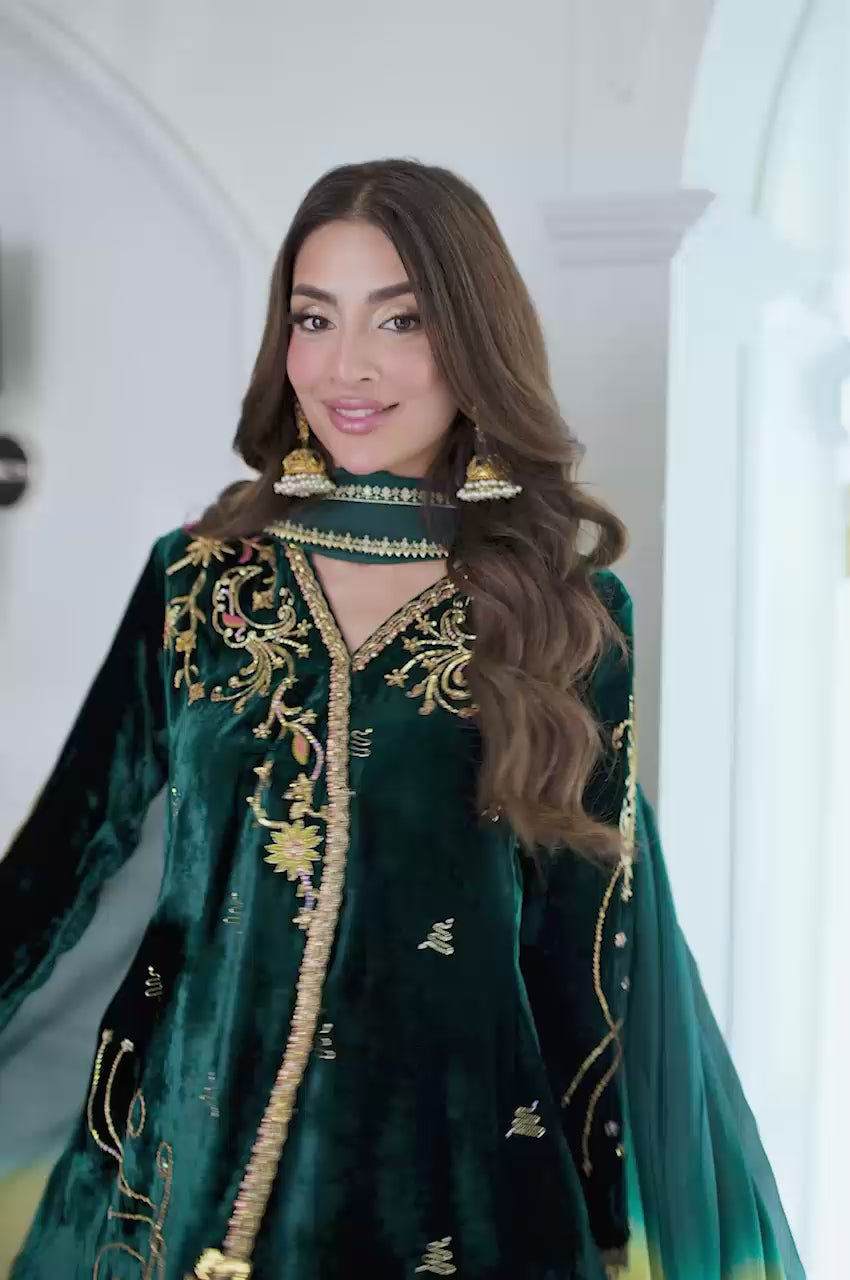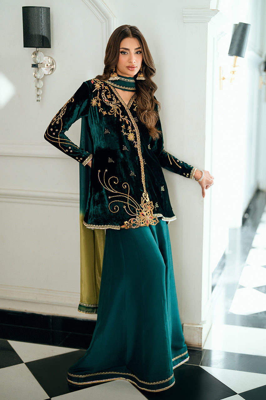 Regal and captivating, this emerald green angrakha is a masterpiece of timeless elegance. Meticulously adorned with intricate cutwork, delicate resham embroidery, and opulent zari detailing, it exudes a rich, artisanal charm. The silhouette flows gracefully, capturing both tradition and modern refinement. Paired with a luxurious raw silk palazzo featuring subtle zari accents and complemented by a two-toned silk dupatta that adds depth and contrast, this ensemble radiates sophistication — a true celebration of heritage craftsmanship and contemporary grace.