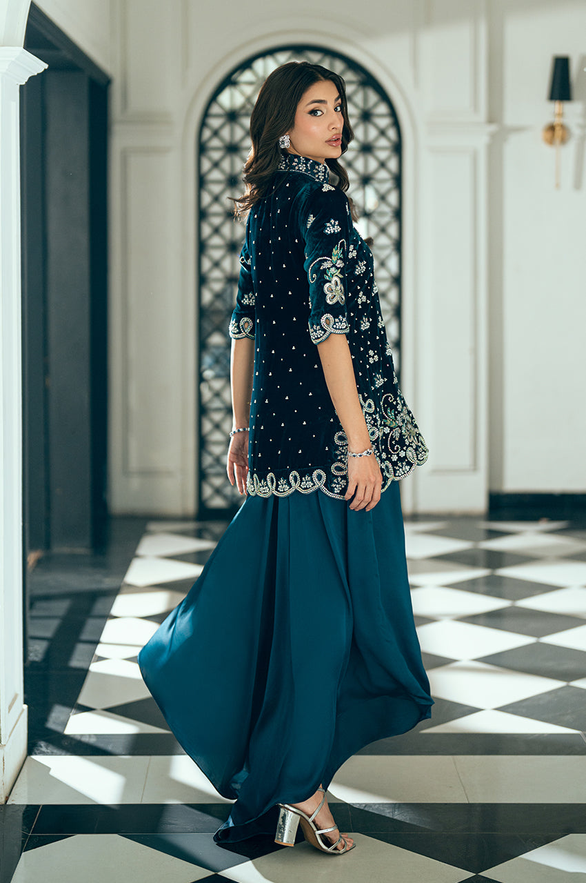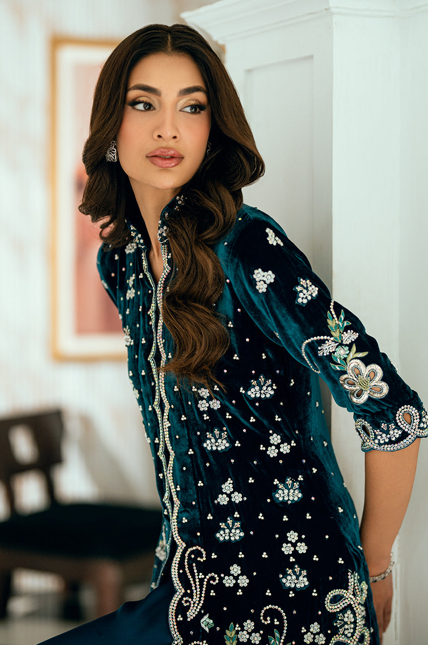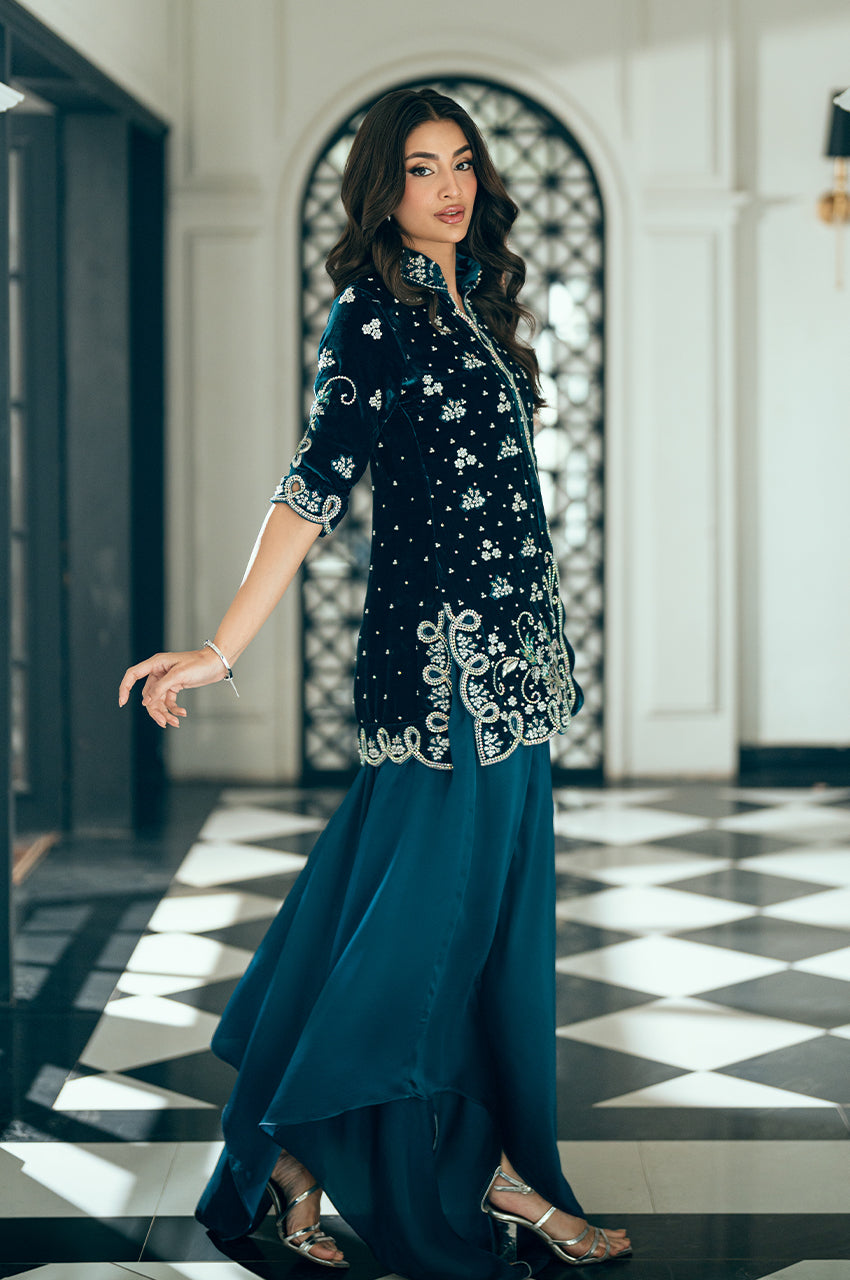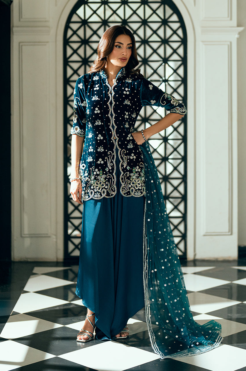 Step into timeless elegance with our Navy Blue Front-Open Velvet Shirt, a perfect fusion of regal craftsmanship and modern charm. The plush velvet base exudes sophistication, while intricate cutwork detailing and delicate kamdani embellishments catch the light with every movement. Adorned with exquisite kacha resham embroidery and 3D floral accents scattered gracefully across the shirt, this ensemble is a true statement of luxury.