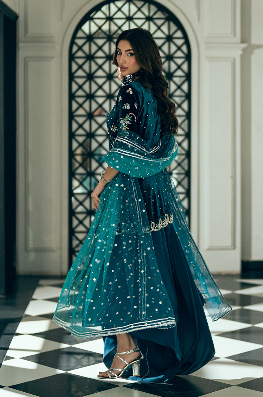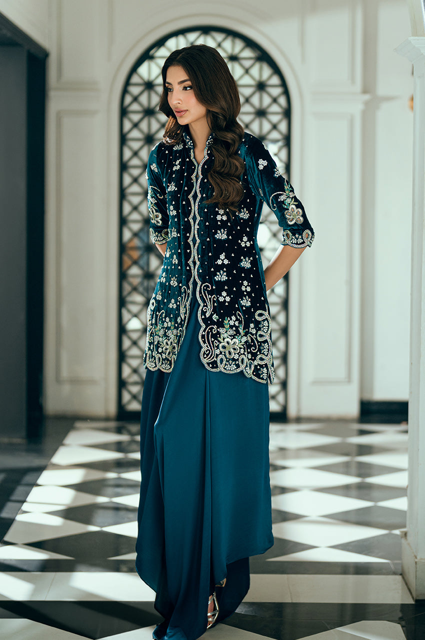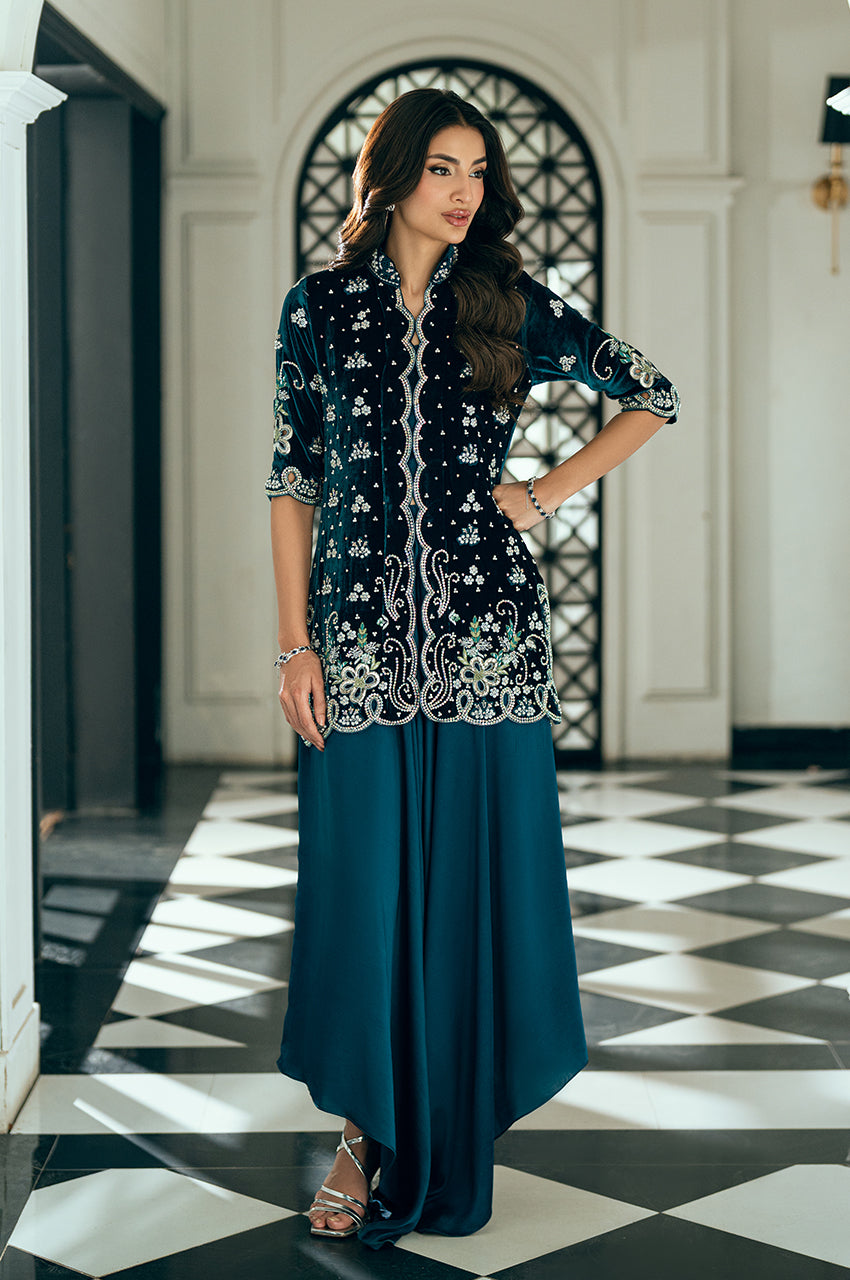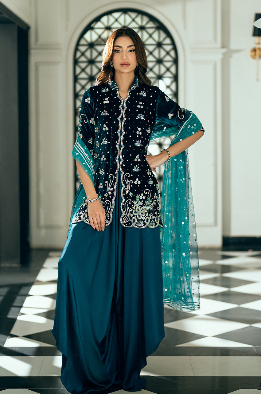 Step into timeless elegance with our Navy Blue Front-Open Velvet Shirt, a perfect fusion of regal craftsmanship and modern charm. The plush velvet base exudes sophistication, while intricate cutwork detailing and delicate kamdani embellishments catch the light with every movement. Adorned with exquisite kacha resham embroidery and 3D floral accents scattered gracefully across the shirt, this ensemble is a true statement of luxury.