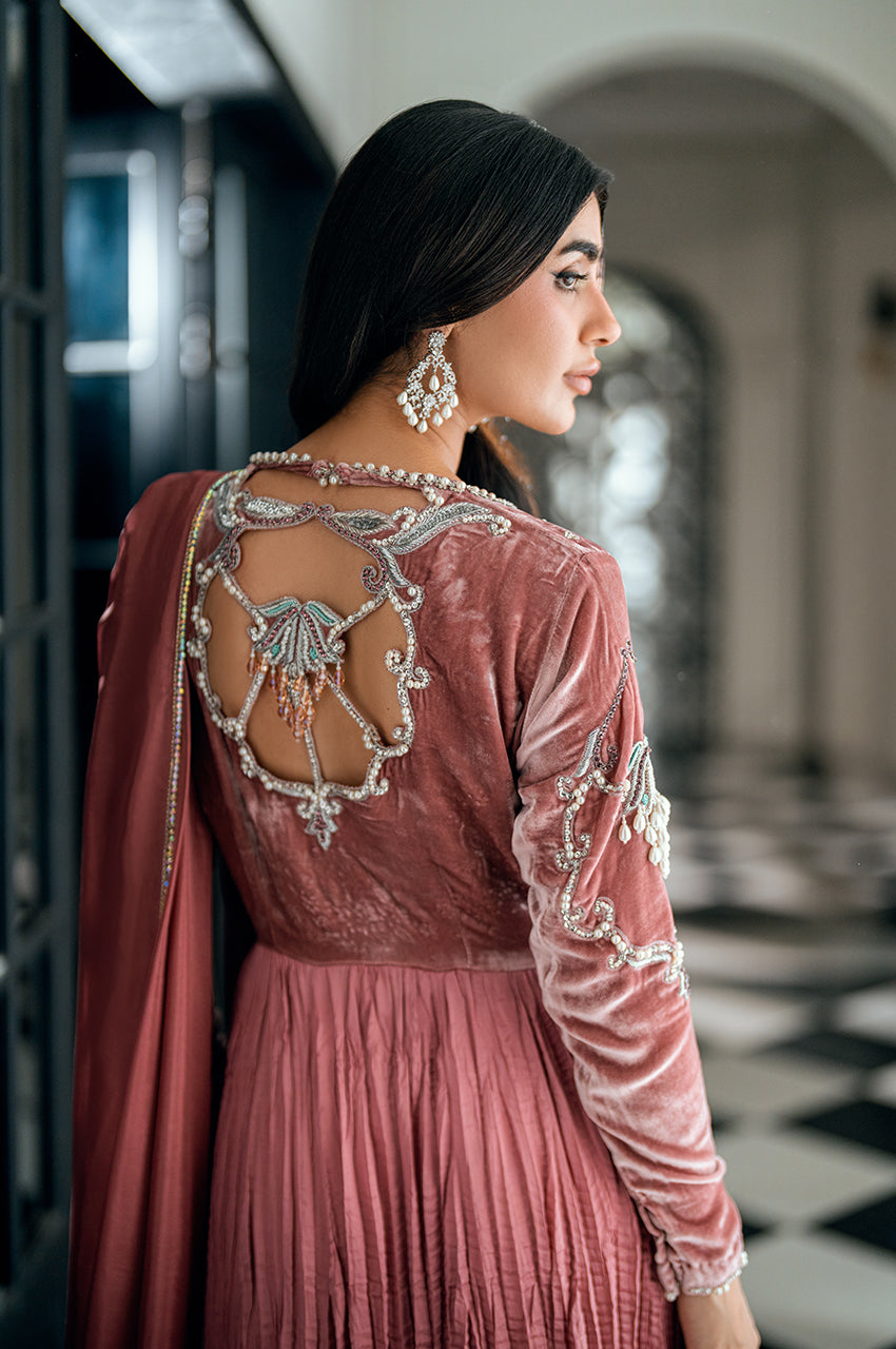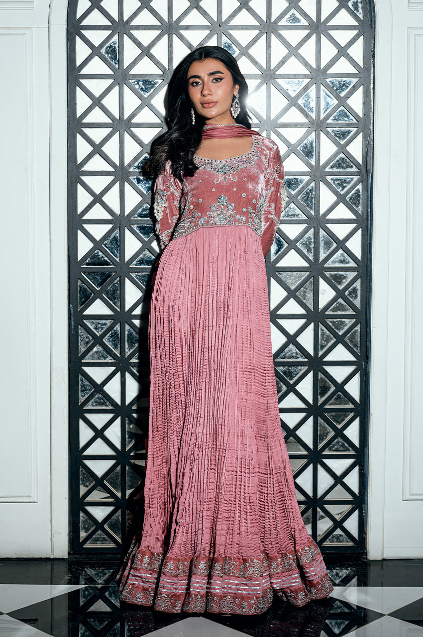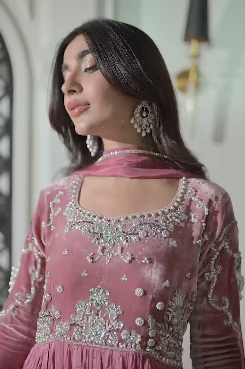 Delicate yet striking, this peony pink velvet peshwas is a vision of wedding-ready elegance. The body is adorned with opulent silver embroidery, featuring intricate cutdana and pearl embellishments that shimmer with every movement. A cutwork back adds a contemporary twist, while the charmeuse crushed flare drapes effortlessly, creating a silhouette that is both graceful and easy to style. Completed with a matching silk dupatta, this ensemble is the perfect harmony of texture, luxury, and festive sophistication — ideal for making a statement at any wedding celebration.