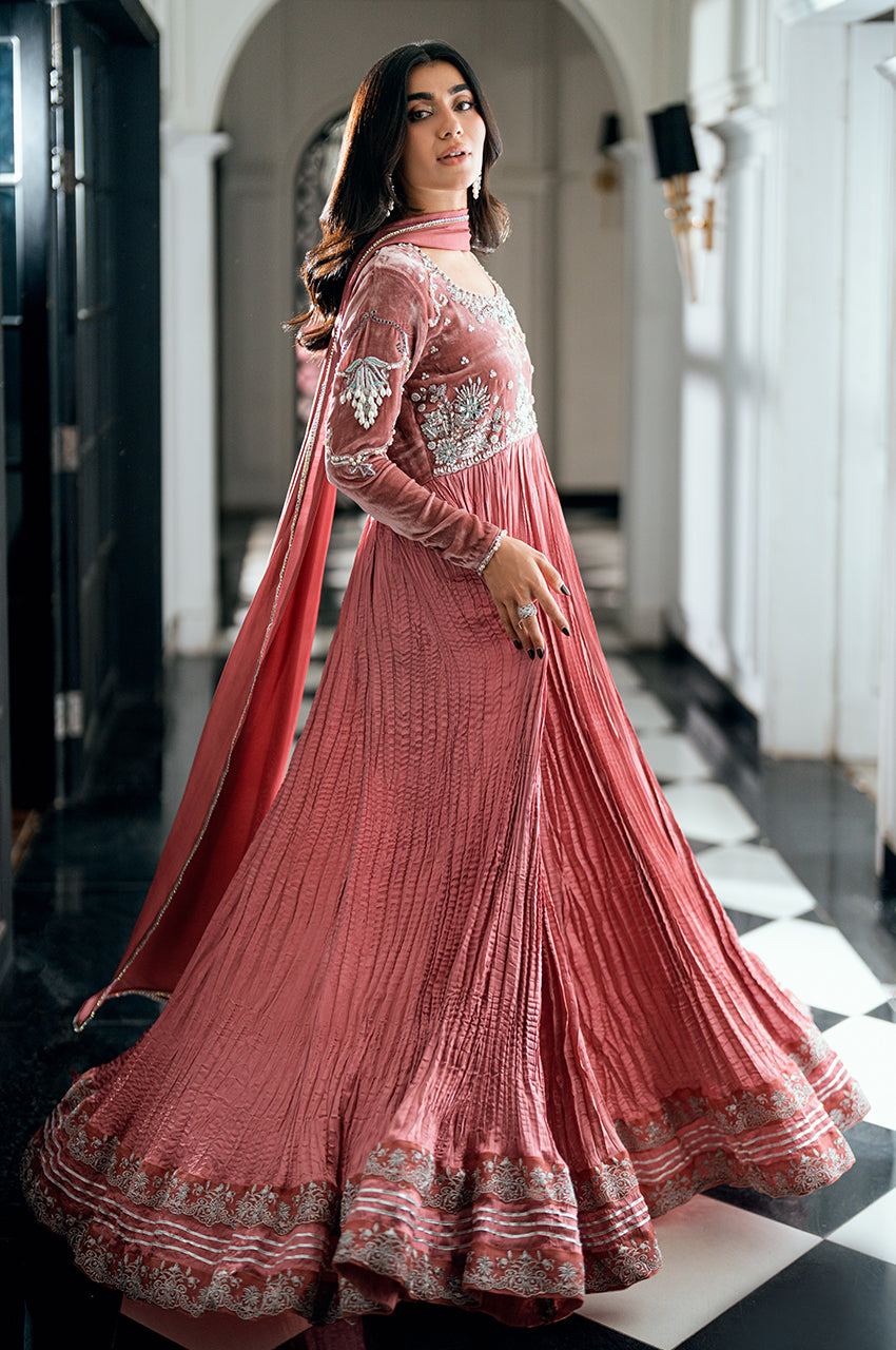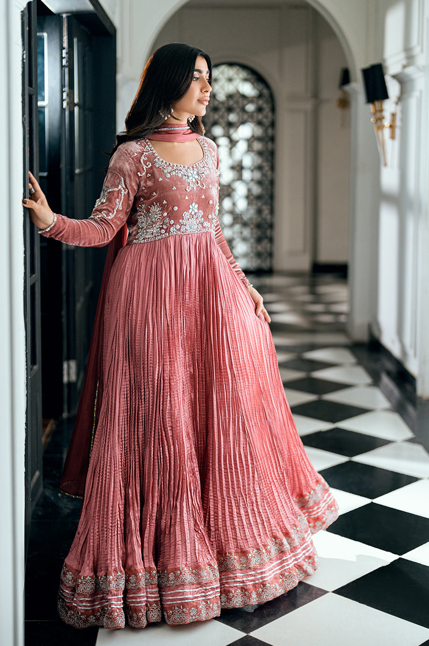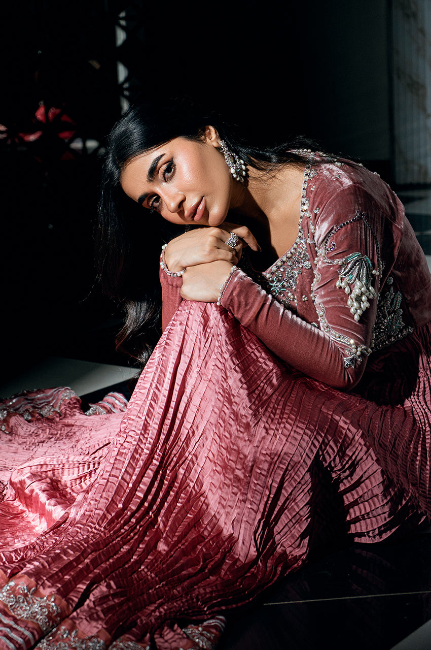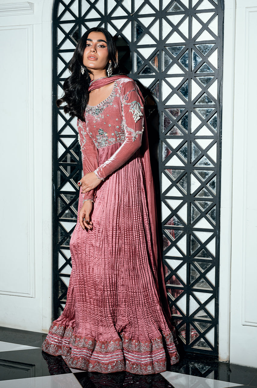 Delicate yet striking, this peony pink velvet peshwas is a vision of wedding-ready elegance. The body is adorned with opulent silver embroidery, featuring intricate cutdana and pearl embellishments that shimmer with every movement. A cutwork back adds a contemporary twist, while the charmeuse crushed flare drapes effortlessly, creating a silhouette that is both graceful and easy to style. Completed with a matching silk dupatta, this ensemble is the perfect harmony of texture, luxury, and festive sophistication — ideal for making a statement at any wedding celebration.