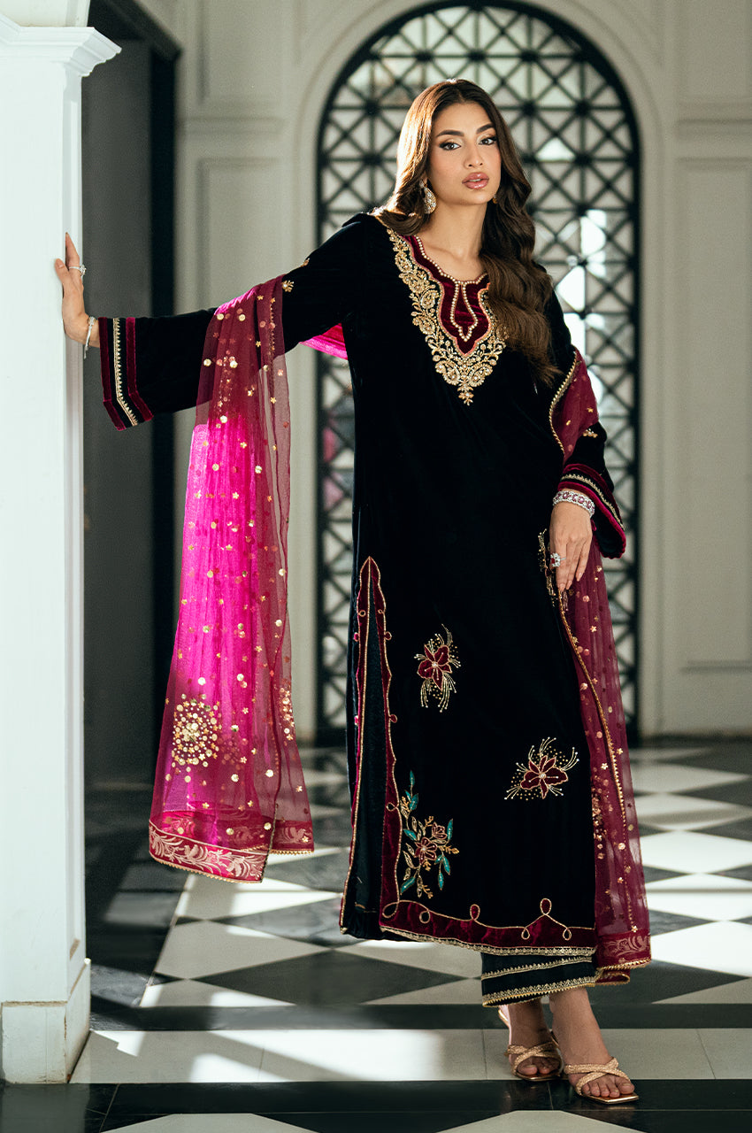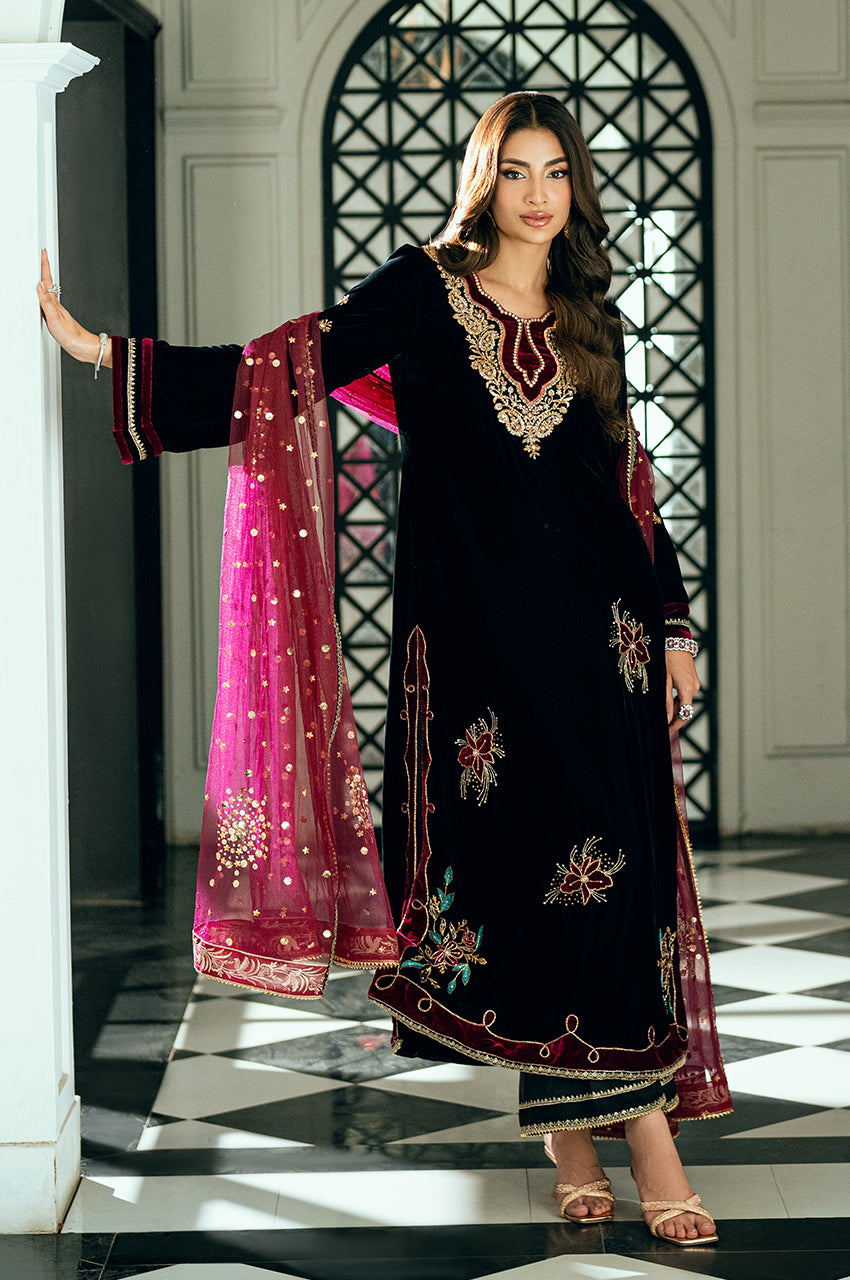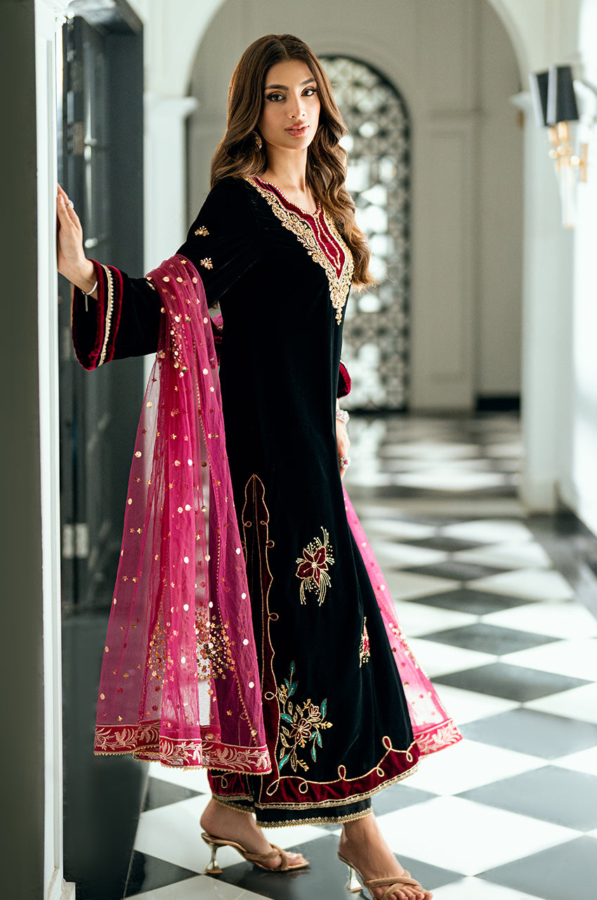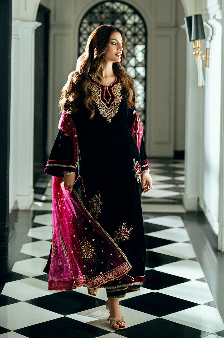 Dramatic and decadent, this black shirt is a celebration of artisanal finesse. The chauk and daman are enriched with meticulously appliqued details, while clusters of pink floral appliqués provide a vibrant contrast, exuding modern sophistication. Kacha resham embroidery and subtle zari accents shimmer delicately across the fabric, reflecting masterful craftsmanship. The ensemble is paired with a contrasting pink dupatta, heavy with chan and intricate zari embellishments, and grounded with a pure raw silk trouser — a perfect harmony of bold color, texture, and luxury, designed to captivate at every glance.