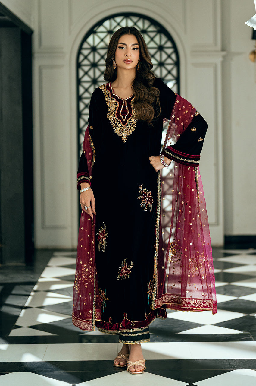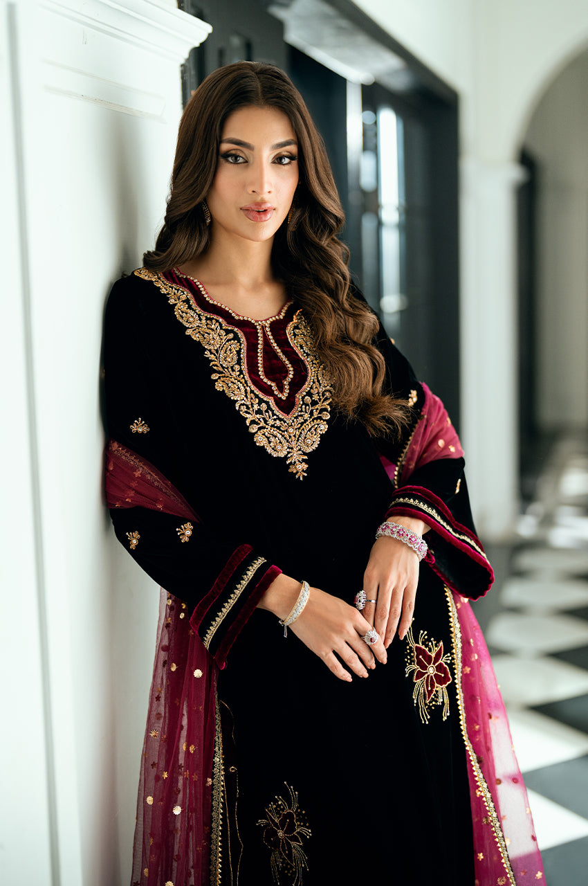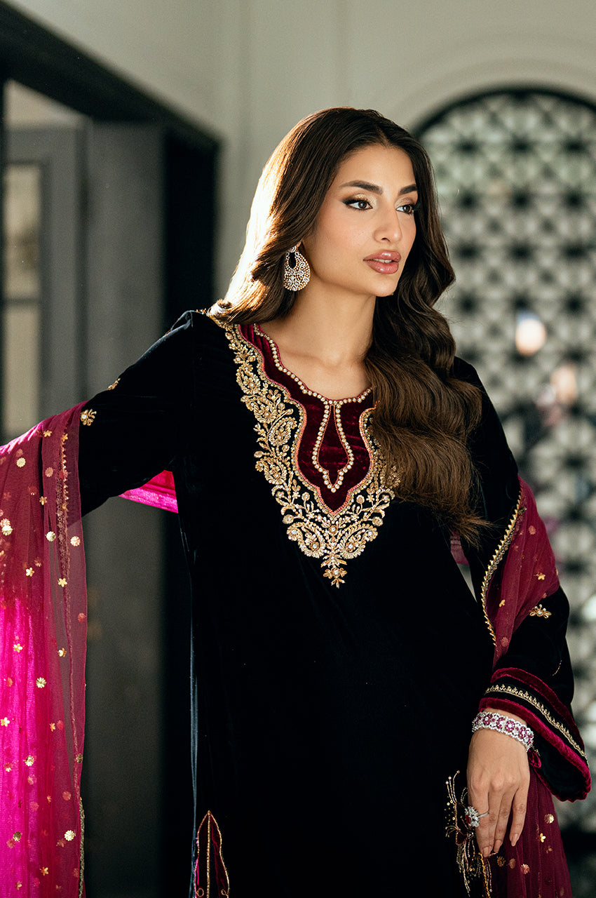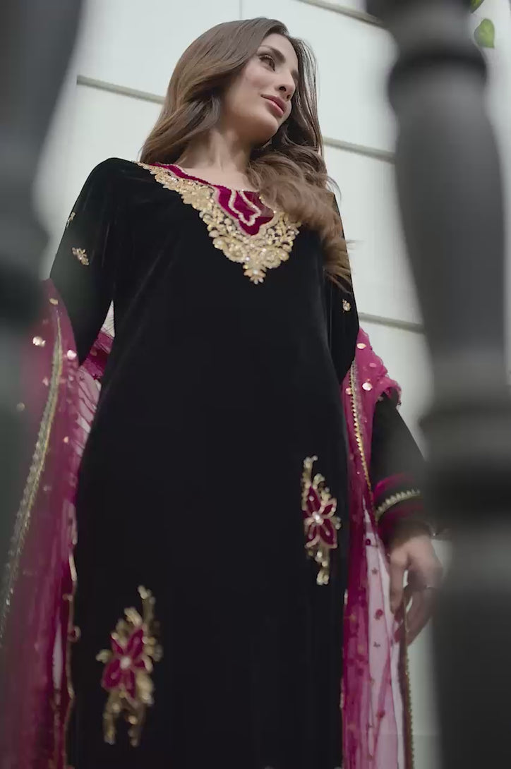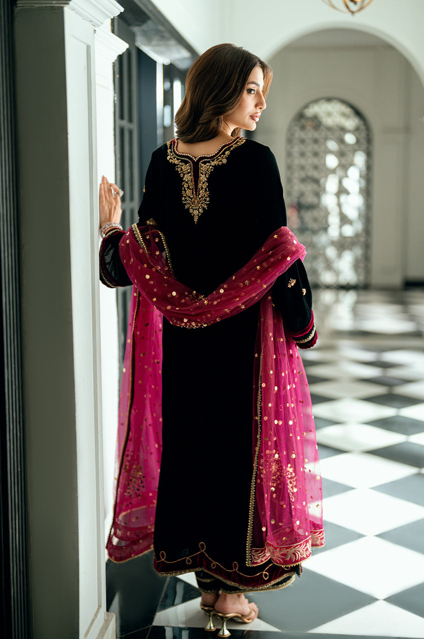 Dramatic and decadent, this black shirt is a celebration of artisanal finesse. The chauk and daman are enriched with meticulously appliqued details, while clusters of pink floral appliqués provide a vibrant contrast, exuding modern sophistication. Kacha resham embroidery and subtle zari accents shimmer delicately across the fabric, reflecting masterful craftsmanship. The ensemble is paired with a contrasting pink dupatta, heavy with chan and intricate zari embellishments, and grounded with a pure raw silk trouser — a perfect harmony of bold color, texture, and luxury, designed to captivate at every glance.