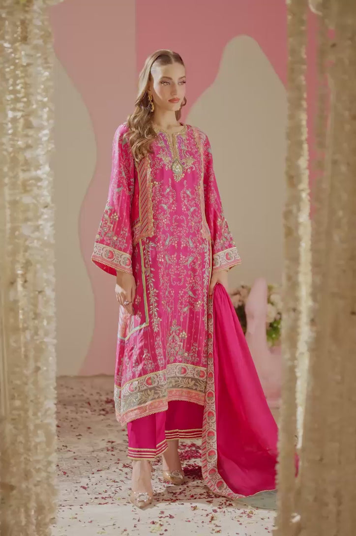 A symphony of color and craftsmanship, this falsa pink printed shirt by Sarah Sheeraz is the epitome of refined elegance. The vibrant hue sets the tone for a look that’s both playful and poised, while intricate gota and cut dana embellishments lend a touch of festive sparkle. Paired with a beautifully printed pure medium silk dupatta that echoes the charm of the ensemble, this look radiates effortless sophistication. Perfect for celebratory soirées or daytime festivities, it’s a modern classic that captures the joyful essence of femininity.