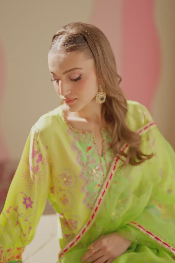 Effortlessly blending contemporary charm with the signature elegance of Sarah Sheeraz, this refreshing kiwi ombré shirt is a vision of understated luxury. Crafted from fine Raw silk fabric and adorned with intricate zari detailing, it captures a soft shimmer that moves gracefully with every step. Paired with coordinating trousers featuring subtle zari accents and a delicate organza dupatta that adds an ethereal finish, this ensemble exudes timeless sophistication. Perfect for the modern muse, it’s a statement in refined simplicity and effortless grace.