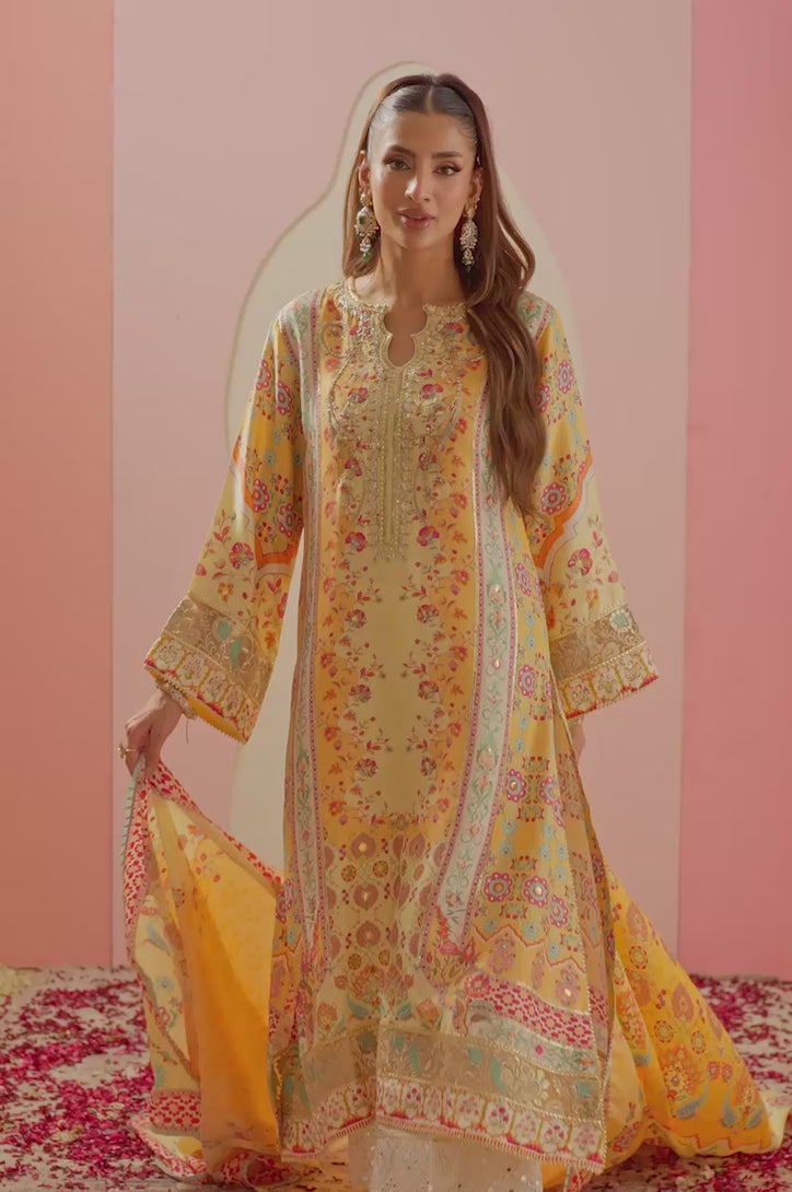 A vision of contemporary elegance, this mustard printed ensemble by Sarah Sheeraz brings together radiant hues and exquisite craftsmanship. The pure fabric shirt is adorned with intricate gota and cutdana work, while the striking white mirror trouser add a refreshing contrast that catches the light with every movement. Paired with a beautifully printed pure medium silk dupatta in harmonizing tones, the look exudes a sense of effortless sophistication. Perfect for festive gatherings or intimate soirées, this design captures the spirit of modern femininity with a timelessly graceful flair.